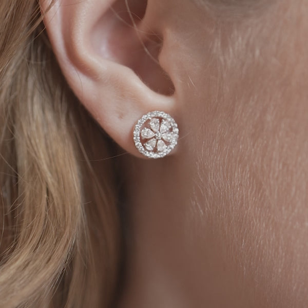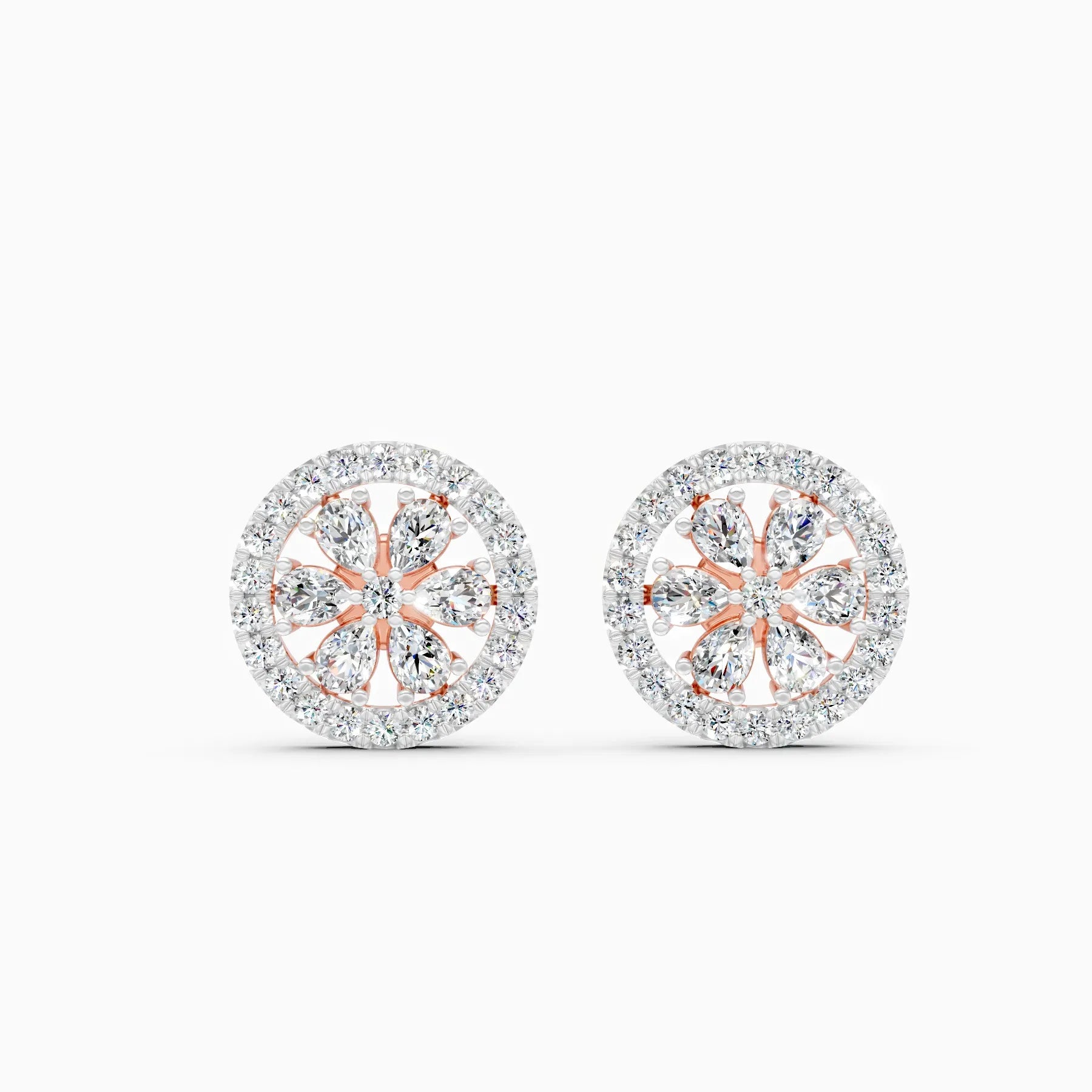 A modern take on classic florals, these round stud earrings feature a halo of round diamonds framing a central flower created with pear-shaped and round lab grown diamonds, set in solid 9K/14K/18K yellow, white and rose gold. Designed for modern women who love elegant sparkle, the flat, full-coverage face sits comfortably on the lobe while the secure screw backs make them easy to wear all day. Style them as your go-to pair for office meetings, brunches, weddings or festive evenings when you want a refined yet striking touch of conscious luxury.