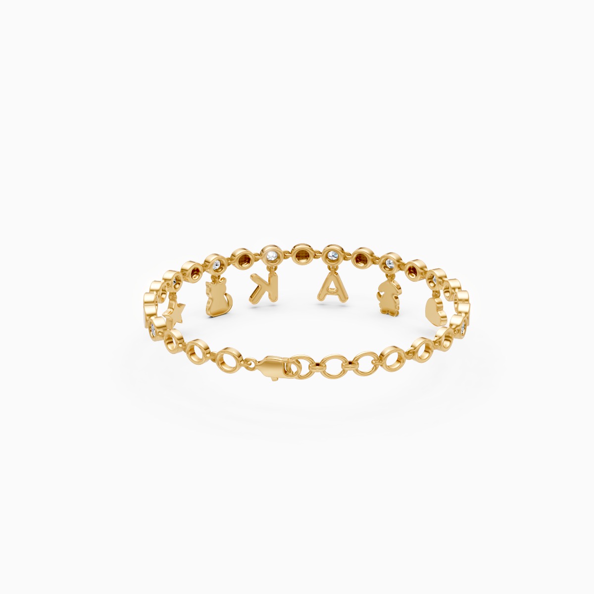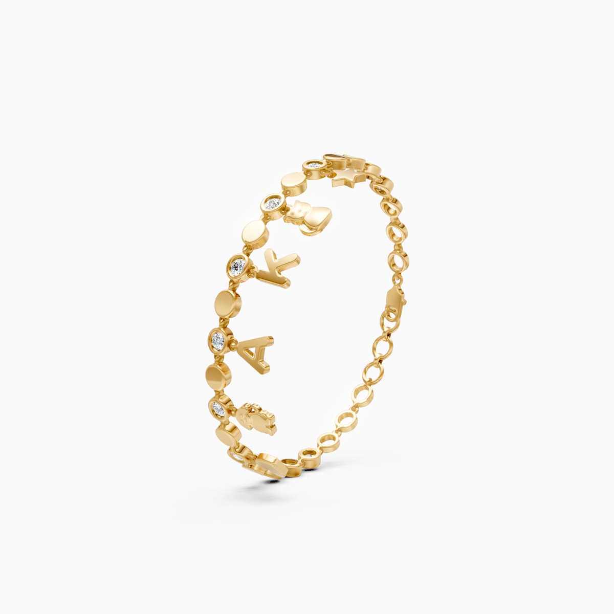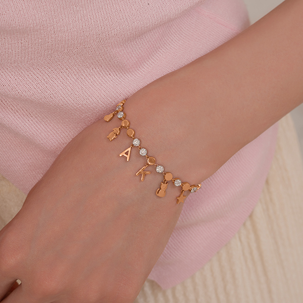 0 StoneA playful keepsake reimagined in conscious luxury. This AK charm bracelet is crafted in solid rose gold and dotted with bezel-set lab-grown diamonds along a fluid line of polished discs. From the centre fall tiny stories in gold – a heart, child motif, A and K initials, a chic kitty and a star – creating a personalised, talisman-like piece you’ll reach for every day. Light on the wrist yet full of detail, it stacks effortlessly with your watch or bangles and makes a thoughtful gift for someone whose initials – and sparkle – you love.