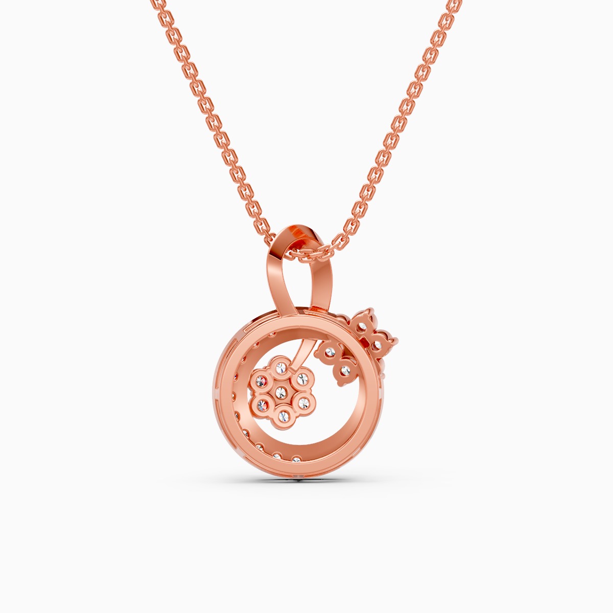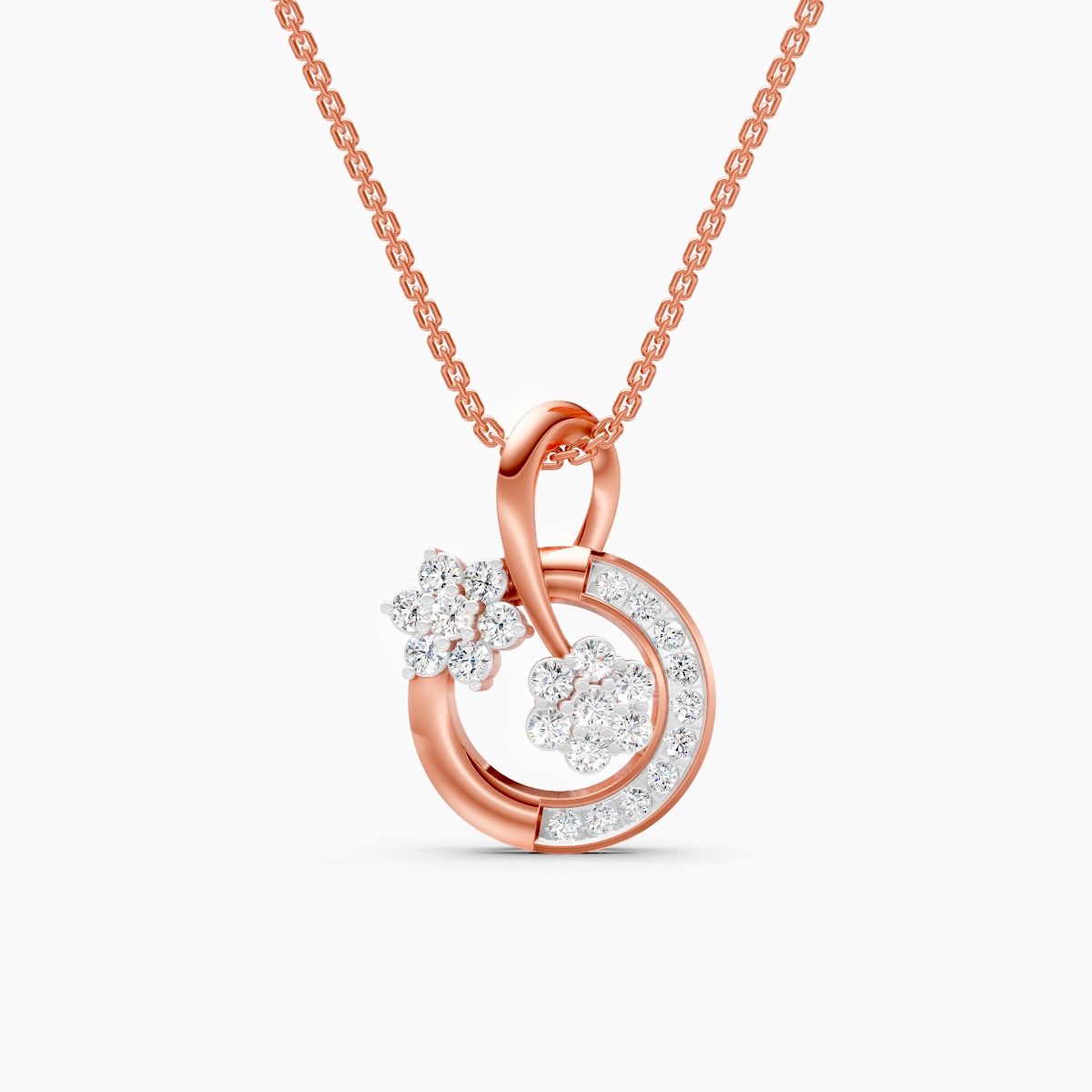 0 StoneA playful yet polished piece, this twin floral swirl pendant features round lab grown diamonds arranged in delicate blooms that sit on a graceful circular curve, crafted in solid 9K/14K/18K yellow, white or rose gold. The open, looping silhouette sits light on the neckline while the diamond clusters catch the light with every move, making it an easy everyday signature that also dresses up beautifully for office, brunches and special evenings. Designed for modern women who love feminine details with a contemporary twist, it offers the conscious sparkle of conflict-free, planet-friendly lab grown diamonds in a piece that feels comfortable and effortless all day long.