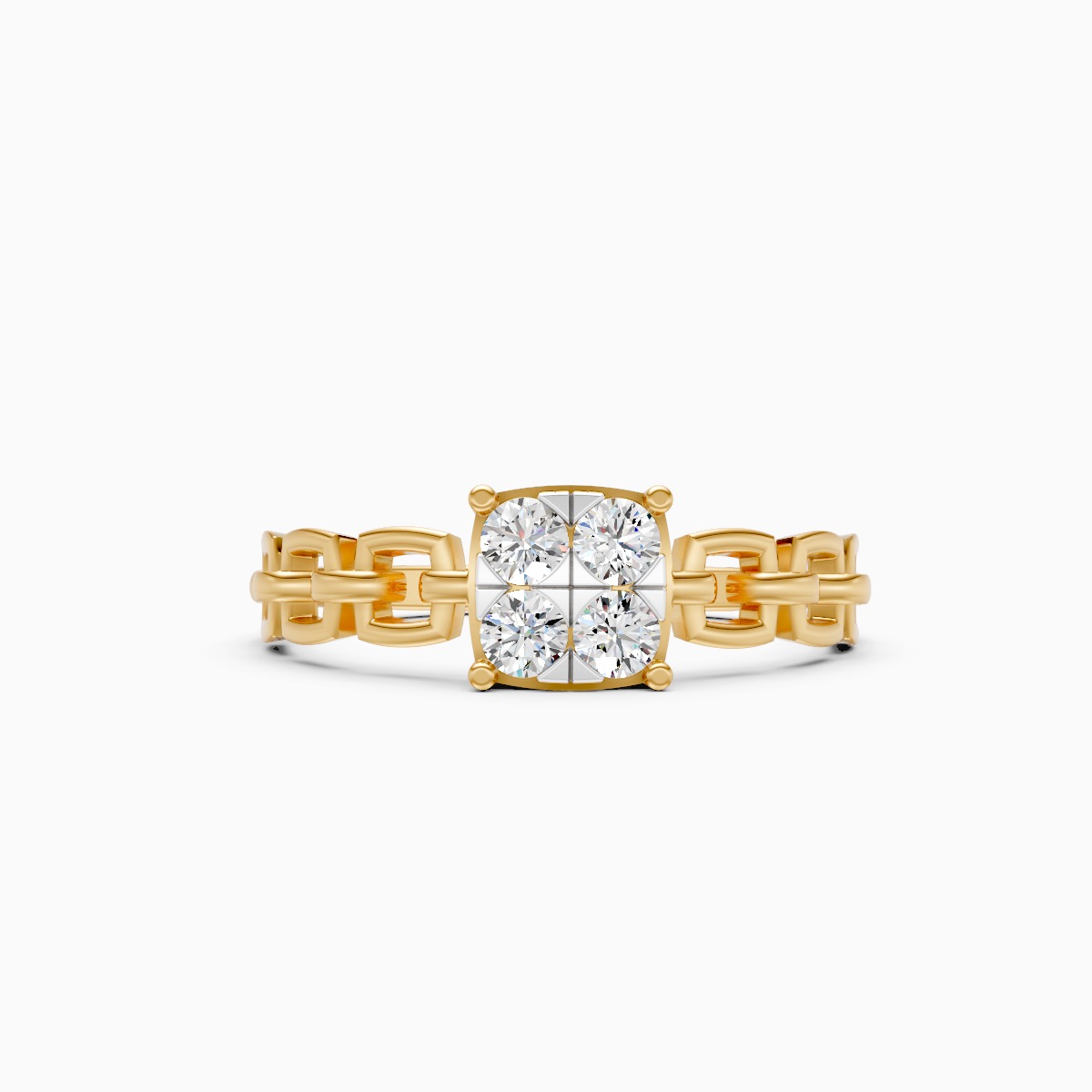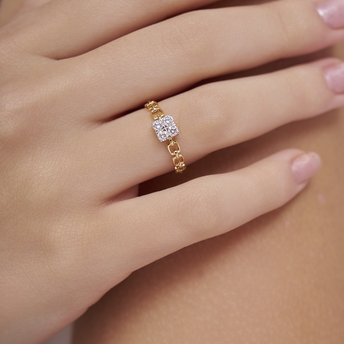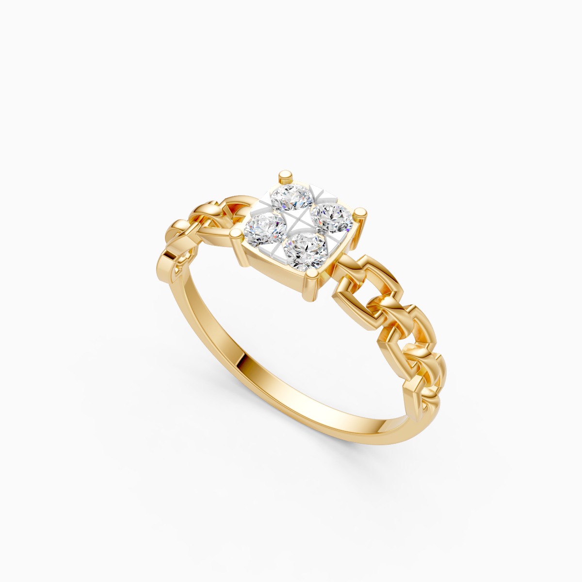 0 StoneThis cushion cluster chain ring features a striking cluster of round lab-grown diamonds arranged in a soft cushion silhouette, paired with a delicate chain-link inspired band that adds a bold yet refined character. Designed for modern women, it is set with lab-grown diamonds in 9K/14K/18K yellow, white and rose gold, offering a contemporary take on everyday fine jewellery. The structured cluster provides noticeable sparkle while the slim band ensures a comfortable, balanced fit on the finger. Modern and expressive, this ring works beautifully for daily wear, office styling, date nights, and special occasions where subtle glamour is desired. Crafted with conflict-free, planet-conscious lab-grown diamonds, it is a thoughtful choice for women who love statement details blended with conscious luxury and timeless design.
