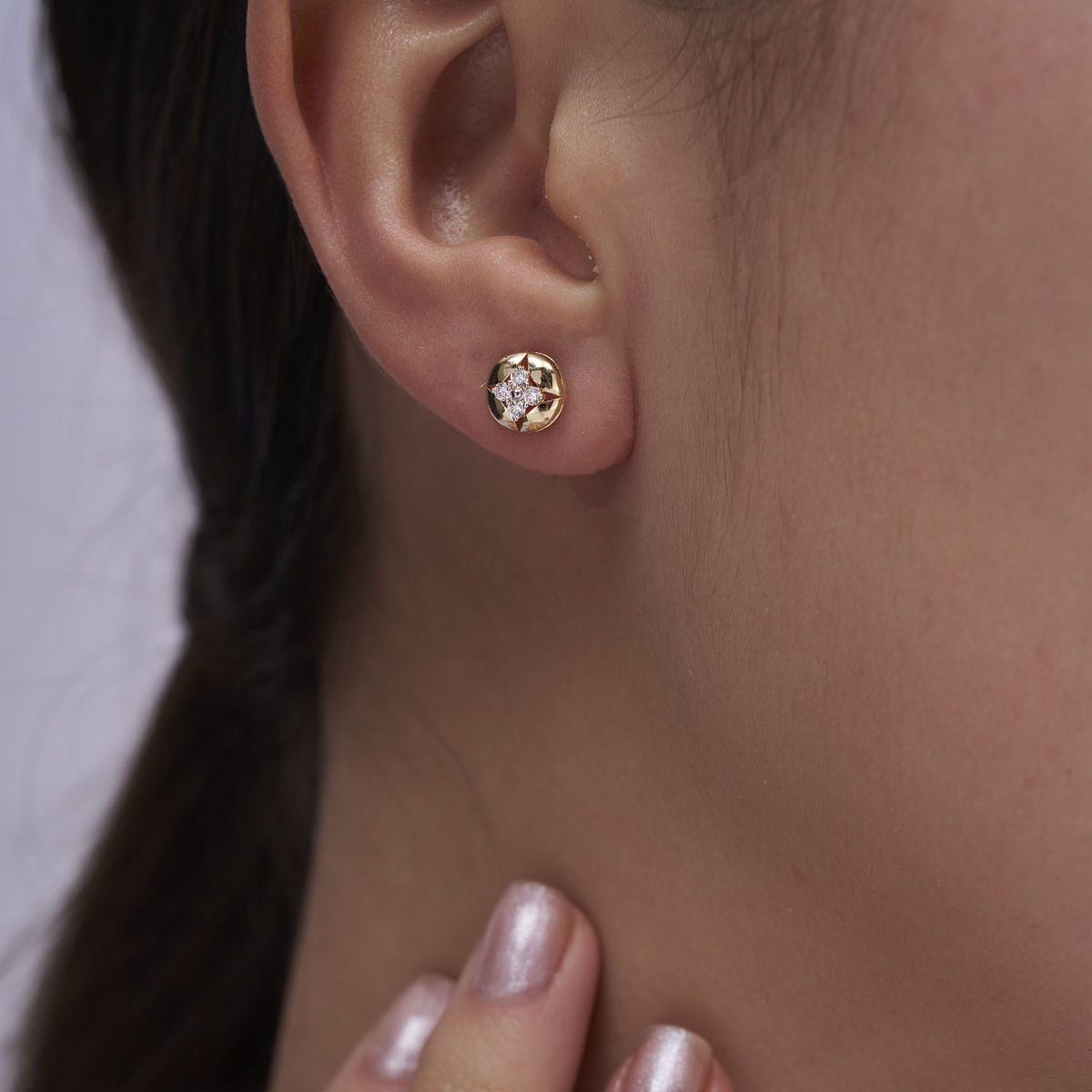 0 StoneDesigned with a sleek round disc silhouette and a central star-inspired cluster of round lab-grown diamonds, these modern stud earrings are set in solid 9K/14K/18K yellow, white, or rose gold for a refined yet contemporary look. The smooth, polished gold surface frames the diamond cluster beautifully, creating a balanced design that feels elegant without being overpowering. Lightweight, skin-friendly, and comfortable on the ear, these studs sit flat and secure, making them ideal for modern women who want subtle sparkle for everyday wear. Crafted with conflict-free, planet-conscious lab-grown diamonds, they transition effortlessly from office hours to brunches, date nights, and special occasions as a timeless, everyday essential.