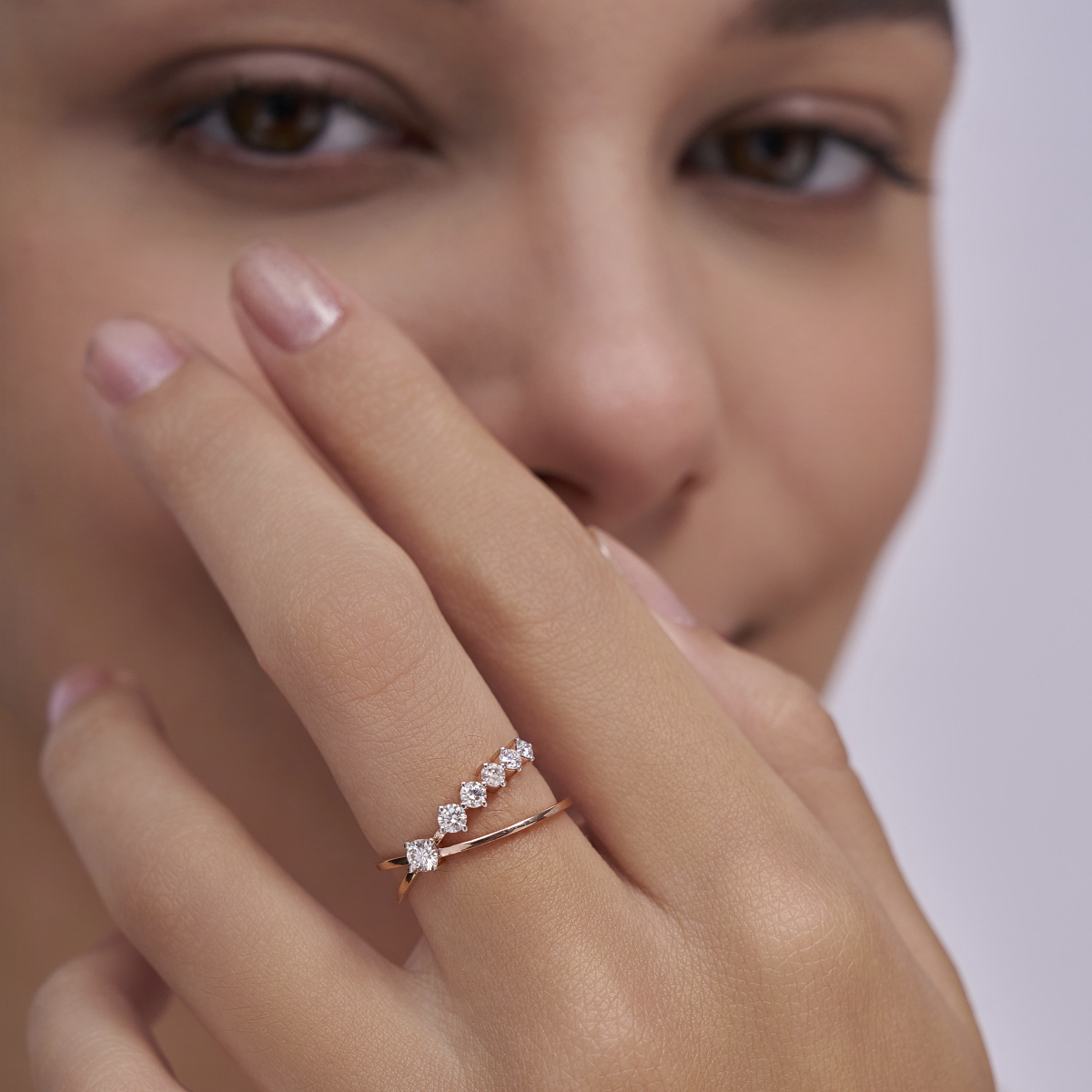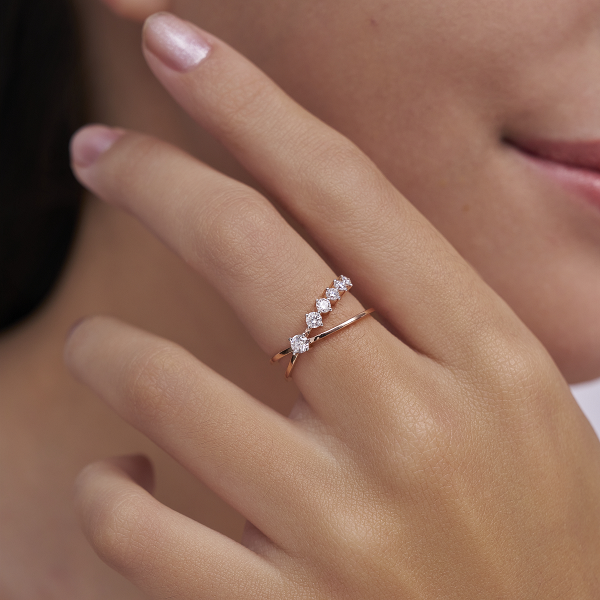 0 StoneA modern twist on a classic band, this crossover five stone ring features a sleek criss-cross shank crowned with a row of graduated round lab-grown diamonds that sit slightly diagonal across the finger, creating an elegant line of sparkle. Crafted in solid 9K/14K/18K yellow, white or rose gold, the slim, smooth band feels lightweight and comfortable for all-day wear while the open crossover design keeps it airy and contemporary. Perfect for modern women who love everyday diamonds, this ring moves effortlessly from office hours to dinners and weekend plans, stacking beautifully with your existing bands or standing out as your daily signature.