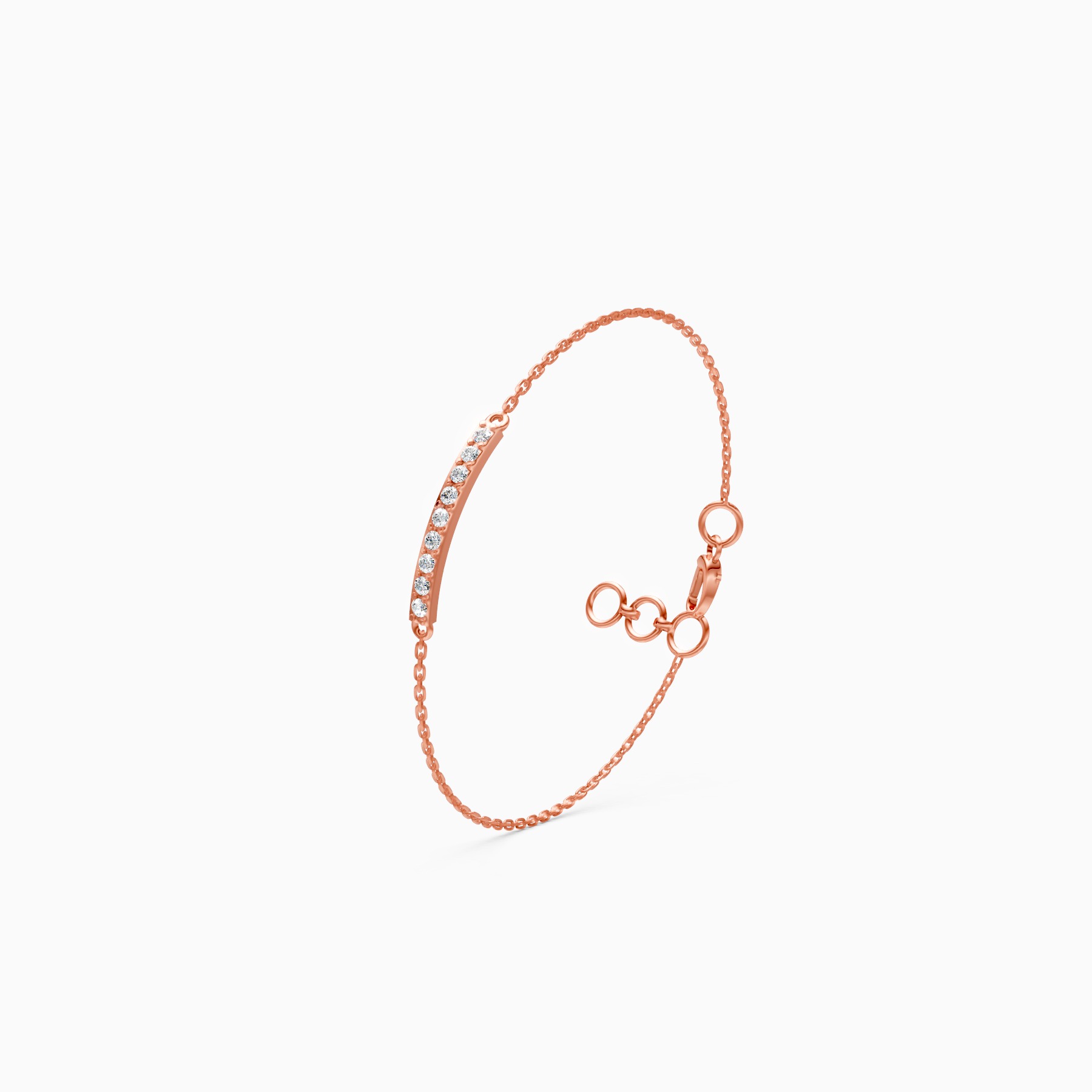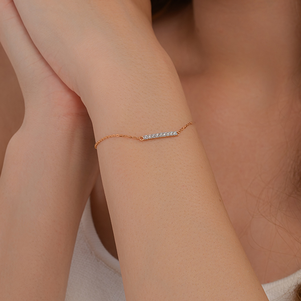0 StoneA quietly luxurious essential, this minimal diamond bar bracelet features a slender curved bar dotted with round lab grown diamonds, set on a fine chain in solid 9K/14K/18K yellow, white or rose gold. The dainty bar sits comfortably along the wrist, catching light with every move while the adjustable clasp ensures an easy, secure fit for modern women on the go. Lightweight yet polished, it’s perfect for daily and office wear, subtle date nights and effortless stacking with your watch or other bracelets. Crafted with conflict-free, planet-conscious lab grown diamonds, it’s an everyday piece that pairs clean design with conscious sparkle.