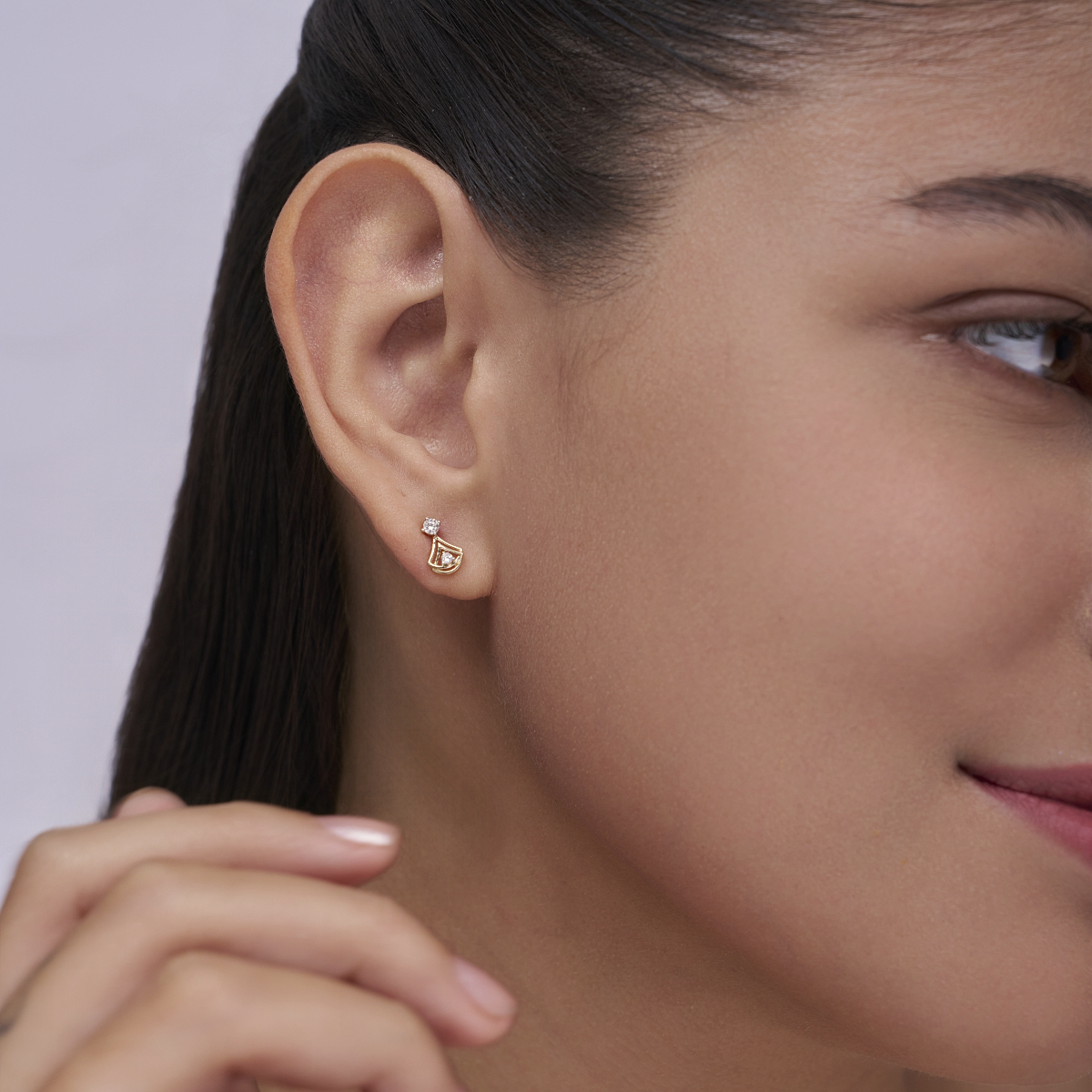 0 StoneThese elegant diamond stud earrings feature round lab-grown diamonds arranged in a refined dual-curve geometric motif, creating a delicate balance of sparkle and sculptural design. Crafted in solid gold and available in 9K, 14K, and 18K yellow, white, and rose gold, they are set with conflict-free, lab-grown diamonds that reflect a modern, planet-conscious approach to fine jewellery. Lightweight and comfortable on the ear, these studs sit beautifully for all-day wear, making them ideal for modern women who prefer subtle yet distinctive sparkle. Perfect for daily wear, office looks, brunches, or understated date nights, they transition effortlessly from work hours to evening plans as a timeless everyday essential.