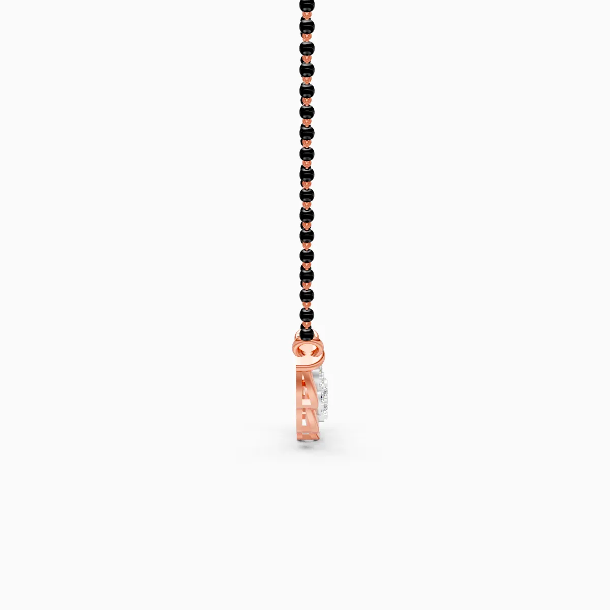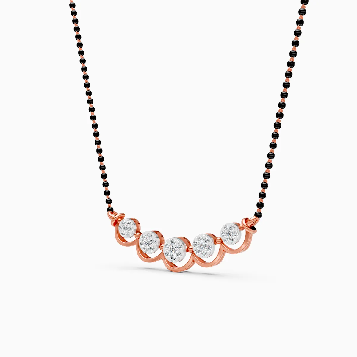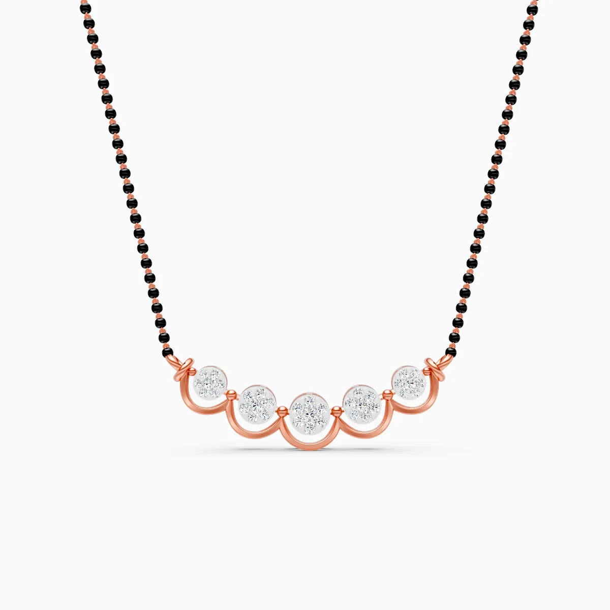 1 StoneA modern twist on the classic mangalsutra, this design features five round diamond clusters flowing along a gentle arc, suspended from sleek black beads for a balanced, contemporary look. Set with lab grown diamonds in solid 9K/14K/18K yellow, white or rose gold, it offers a conflict-free, planet-conscious alternative to mined diamonds without compromising on brilliance. The smooth curved bar sits comfortably at the collarbone, making it perfect for modern women who love an elegant mangalsutra they can wear every day—whether it’s with office formals, casual brunch outfits or softly dressed-up evenings. Lightweight yet luminous, it’s designed to be your effortless, signature daily-wear piece.