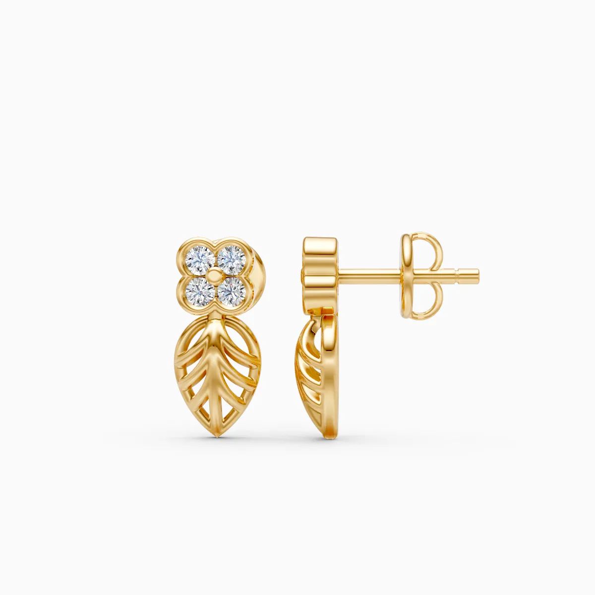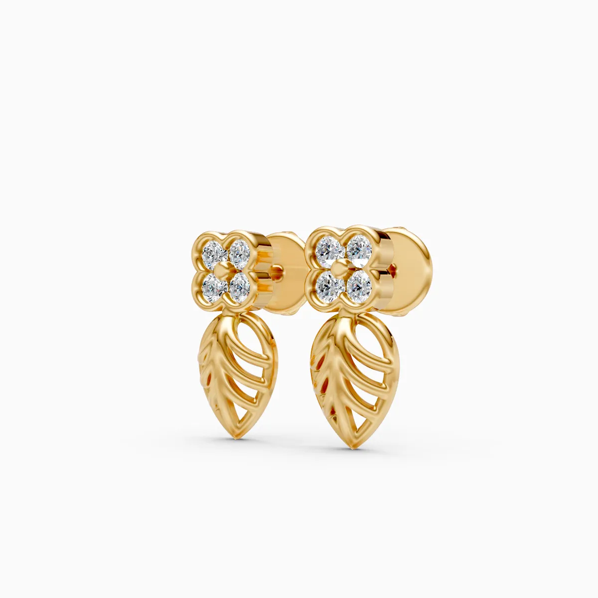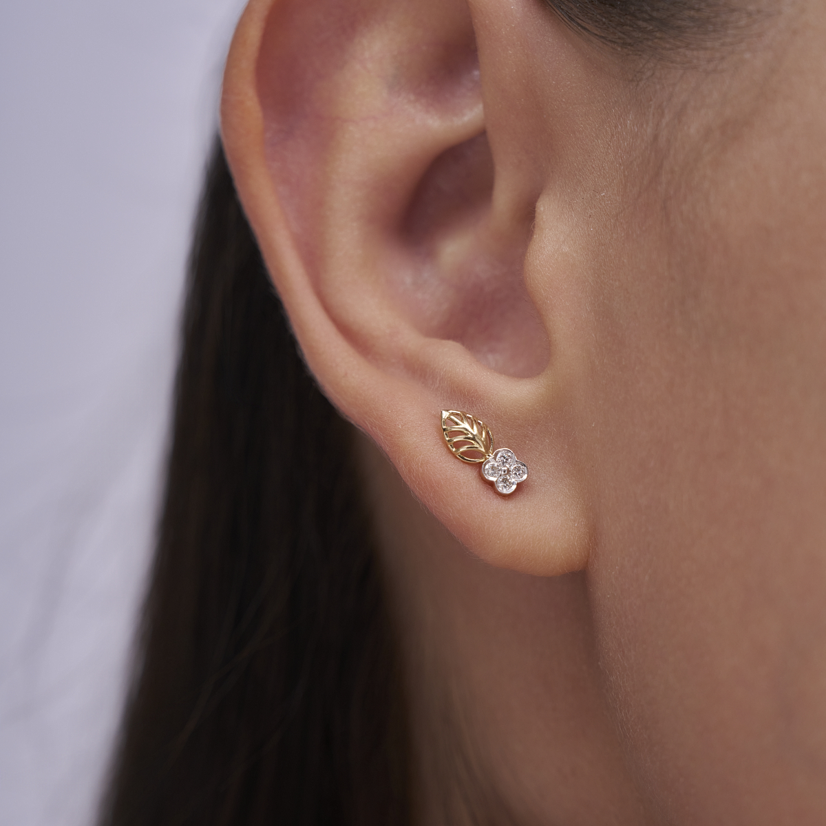 0 StoneThese elegant stud earrings feature round lab-grown diamonds arranged in a delicate floral cluster, paired with a graceful leaf-inspired drop for a soft, nature-led silhouette. Set with lab-grown diamonds in 9K/14K/18K yellow, white and rose gold, the design feels lightweight, refined, and comfortable against the ear, making it ideal for modern women who prefer subtle yet distinctive jewelry. The organic floral-and-leaf motif adds a gentle statement without feeling heavy, transitioning effortlessly from daily and office wear to brunches, date nights, and intimate celebrations. Crafted with conflict-free, planet-conscious lab-grown diamonds, these earrings are a thoughtful choice for women who value conscious luxury and timeless design in their everyday style.