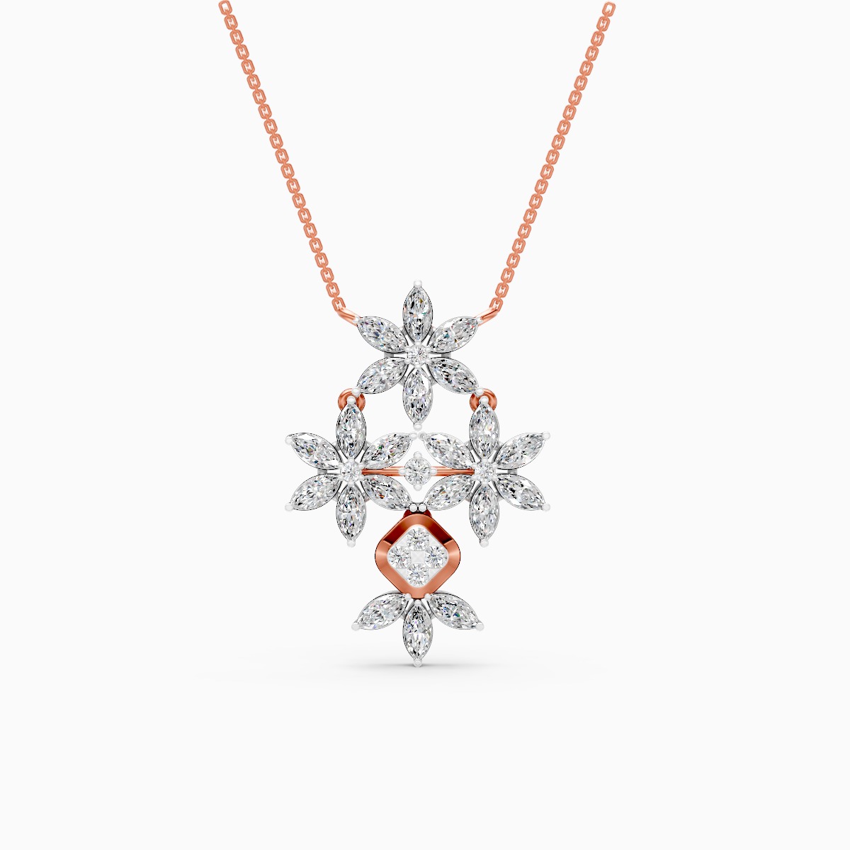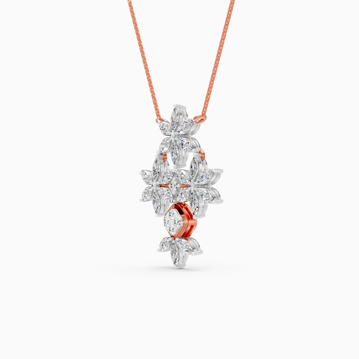 0 StoneBloom with eternal elegance wearing this exquisite pendant, designed as a vertical bouquet of light. The silhouette features a cascading arrangement of three stylized floral motifs, each composed of marquise-cut lab-grown diamonds that mimic delicate, unfolding petals. These dazzling clusters are artfully linked to create a graceful drop, culminating in a geometric kite-shaped accent that adds a refined finish to the botanical theme. With a substantial total diamond weight of approximately 1.87 carats and a length of 31.5mm, this pendant offers a dramatic yet feminine presence that captures attention from across the room. Crafted in your choice of solid 9K, 14K, or 18K yellow, white, or rose gold, it is a conflict-free treasure perfect for bridal wear or special occasions.