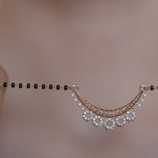 Celebrate your sacred bond with a design that perfectly balances tradition and modern style. This contemporary mangalsutra features a graceful, curved bar of solid gold, intricately detailed with an openwork lattice pattern that adds lightness and artistic depth. Suspended from the arc are five petite, sparkling diamond circles that dance with every movement, adding a playful yet sophisticated rhythm to the piece. Strung on a single line of classic black beads, it offers a refined, minimal look suitable for professional settings and daily wear. Crafted in your choice of solid 9K, 14K, or 18K yellow, white, or rose gold, this necklace is a conflict-free and planet-conscious symbol of love for the modern woman.