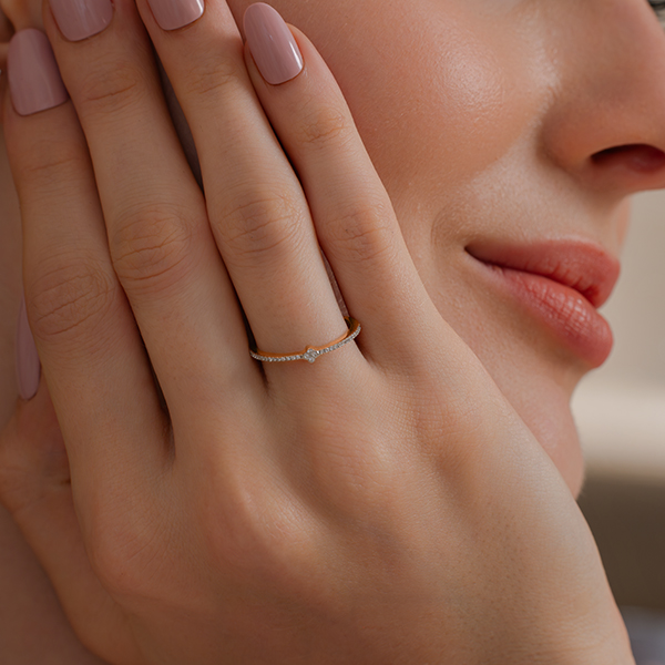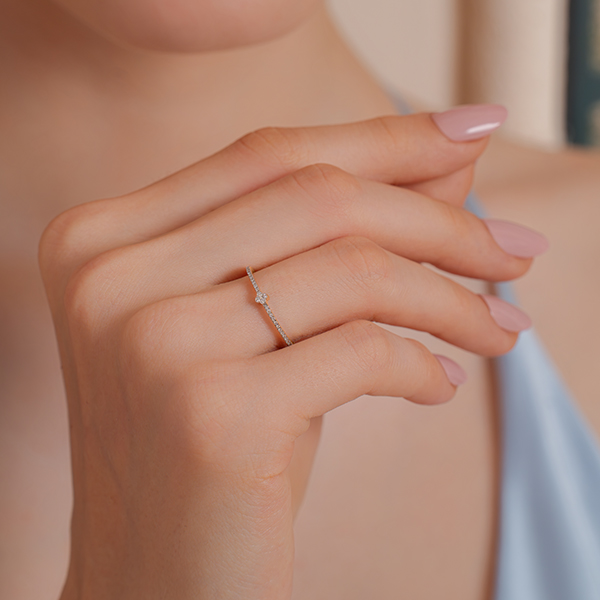 0 StoneEmbrace delicate elegance with this minimal floral ring, designed for the modern woman who appreciates subtle details. This piece features a dainty central bloom, set with four brilliant round lab-grown diamonds, complemented by a sparkling half-pavé diamond band. Crafted in your choice of solid 9K/14K/18K yellow, white, or rose gold, this hypoallergenic and anti-tarnish ring is designed for comfortable, all-day wear. Its lightweight and stackable design makes it a versatile, conflict-free choice—perfect as an everyday signature, a refined addition to your office look, or a sweet touch for a date night.