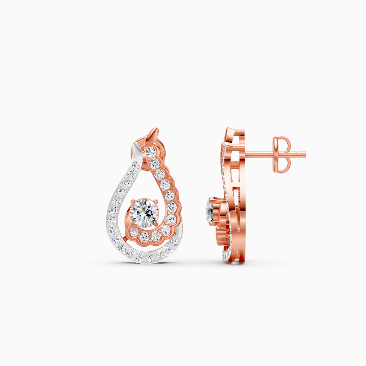 0 StoneThese teardrop spiral studs frame a round lab-grown diamond at the centre, wrapped in scalloped rose-gold curves and an outer white-gold pavé halo for a soft yet striking sparkle. Crafted in solid 9K/14K/18K yellow, white and rose gold, the design hugs the ear comfortably while the secure push-back keeps them in place from busy workdays to evening plans. Conflict-free lab grown diamonds make this a planet-conscious choice for modern women who love refined, feminine shine in their everyday diamond jewellery.