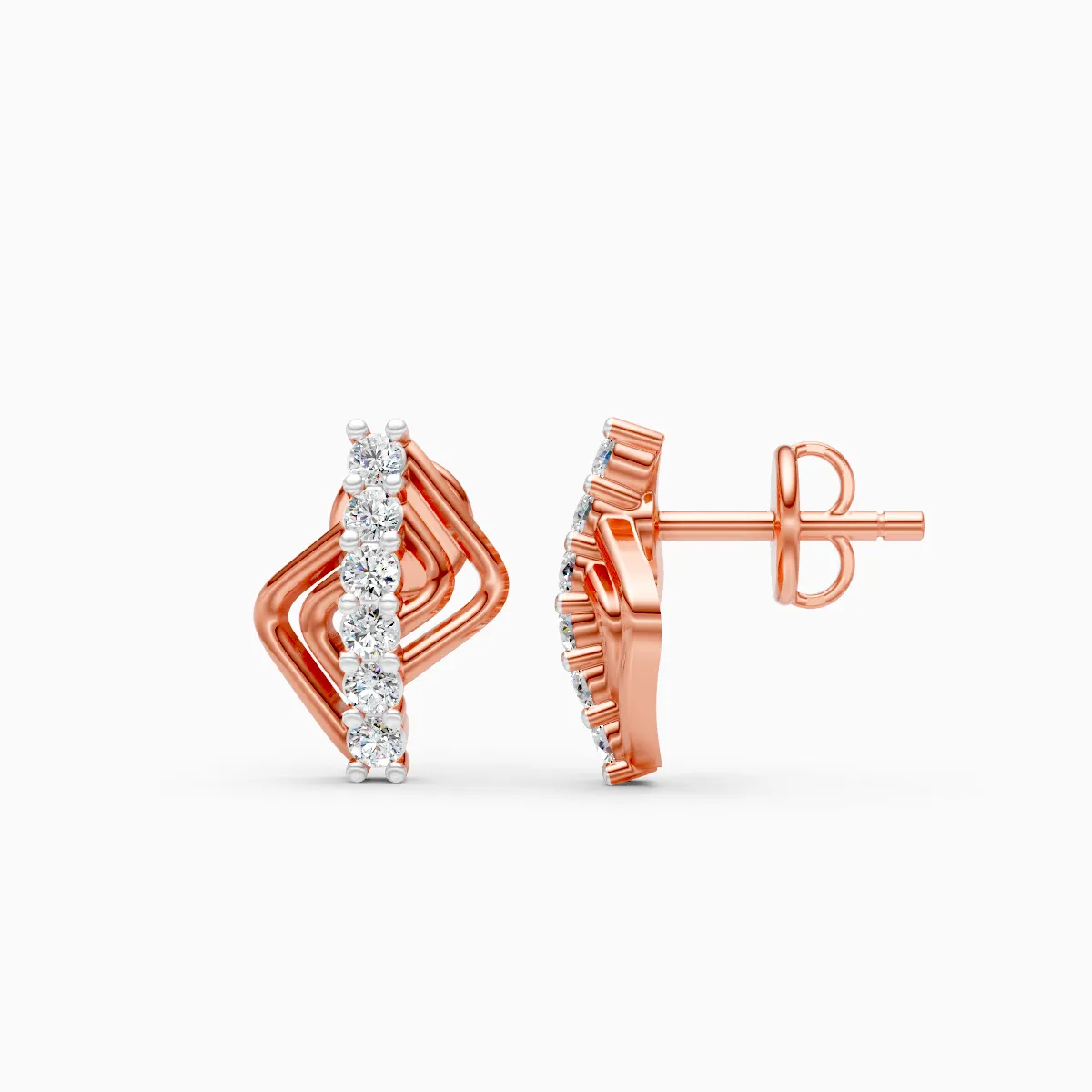 0 StoneThese geometric diamond studs feature a sleek, layered open-frame design accented with a vertical line of round lab-grown diamonds, creating a modern yet refined look for everyday wear. Crafted in solid gold and available in 9K, 14K, and 18K yellow, white, and rose gold, these earrings are set with conflict-free, lab-grown diamonds that offer a conscious and contemporary alternative to mined stones. Lightweight, skin-friendly, and comfortable on the ear, they sit close and secure, making them ideal for long office days, casual outings, brunches, or understated date nights. Designed for modern women who appreciate minimal sparkle with a strong design sensibility, these studs transition effortlessly from daily routines to evening moments, becoming a subtle signature piece in a refined jewellery wardrobe.