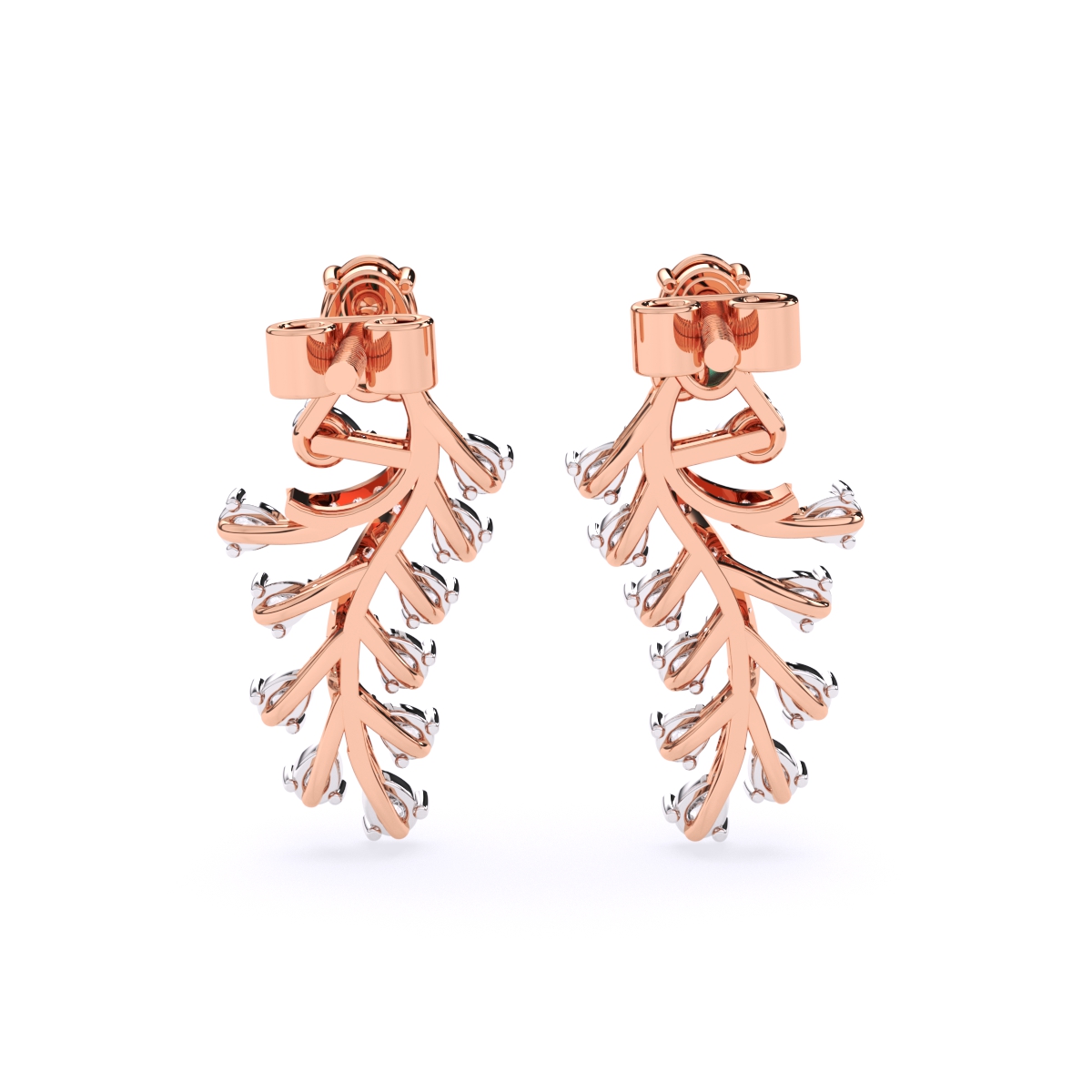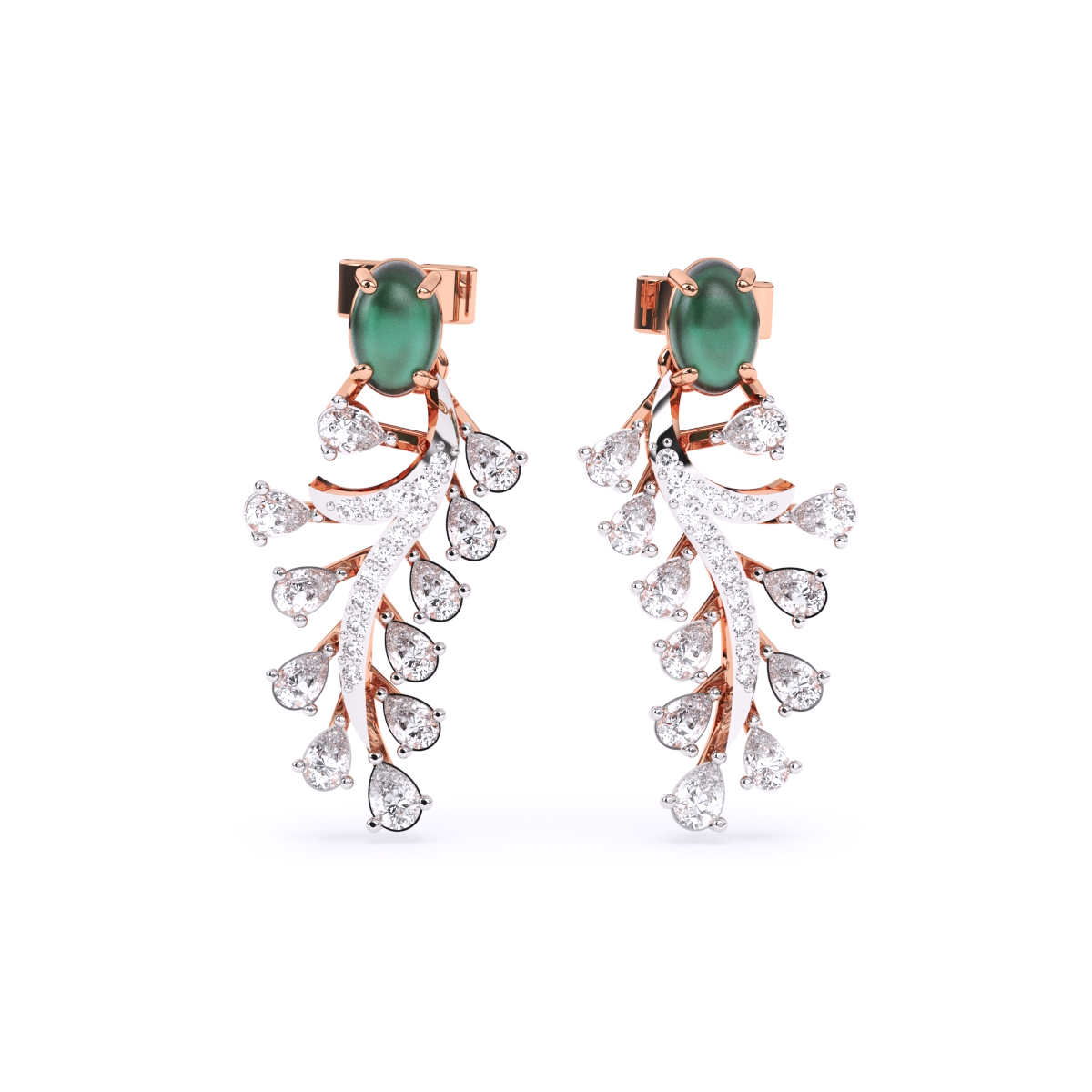 2 StoneStep into an enchanted garden with these exquisite drop earrings, where vibrant color meets organic brilliance. The design is anchored by a luscious oval-shaped green gemstone (lab-grown emerald) at the ear, setting a tone of regal elegance. Cascading from this colorful stud is a graceful, curved vine, its spine lined with pave-set round diamonds. Sprouting from this glittering stem are delicate leaves formed by pear-shaped lab-grown diamonds, creating a fluid, botanical silhouette that frames the face with light and movement. Perfect for adding a touch of nature-inspired luxury to a cocktail dress or evening gown. Crafted in your choice of solid 9K, 14K, or 18K yellow, white, or rose gold, they are a conflict-free celebration of life's blooming moments.