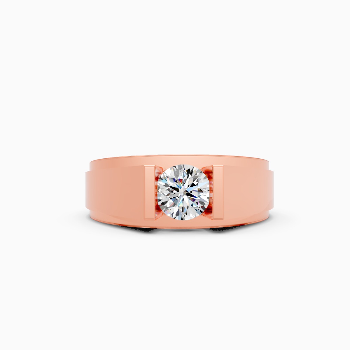 0 StoneMake a bold statement with this contemporary solitaire ring, defined by its architectural lines and substantial presence. The centerpiece is a brilliant round lab-grown diamond (approx. 0.70 ct), securely held in a sleek tension-style setting that allows the stone to "float" between two robust bars of polished gold. The wide band features a sophisticated stepped profile, adding depth and a modern industrial edge to the silhouette. With a solid gold weight of approximately 6.15 grams (in 18K), this ring offers a luxurious, weighty feel on the finger, making it an ideal choice for a men's engagement ring or a power accessory. Crafted in your choice of solid 9K, 14K, or 18K yellow, white, or rose gold, it is a conflict-free symbol of strength and style.