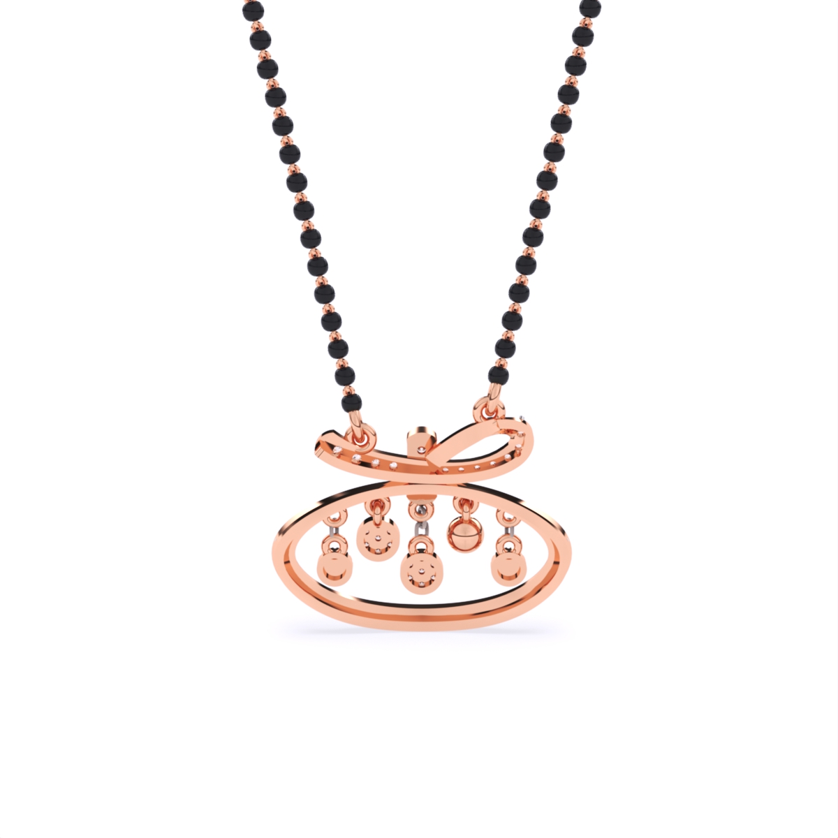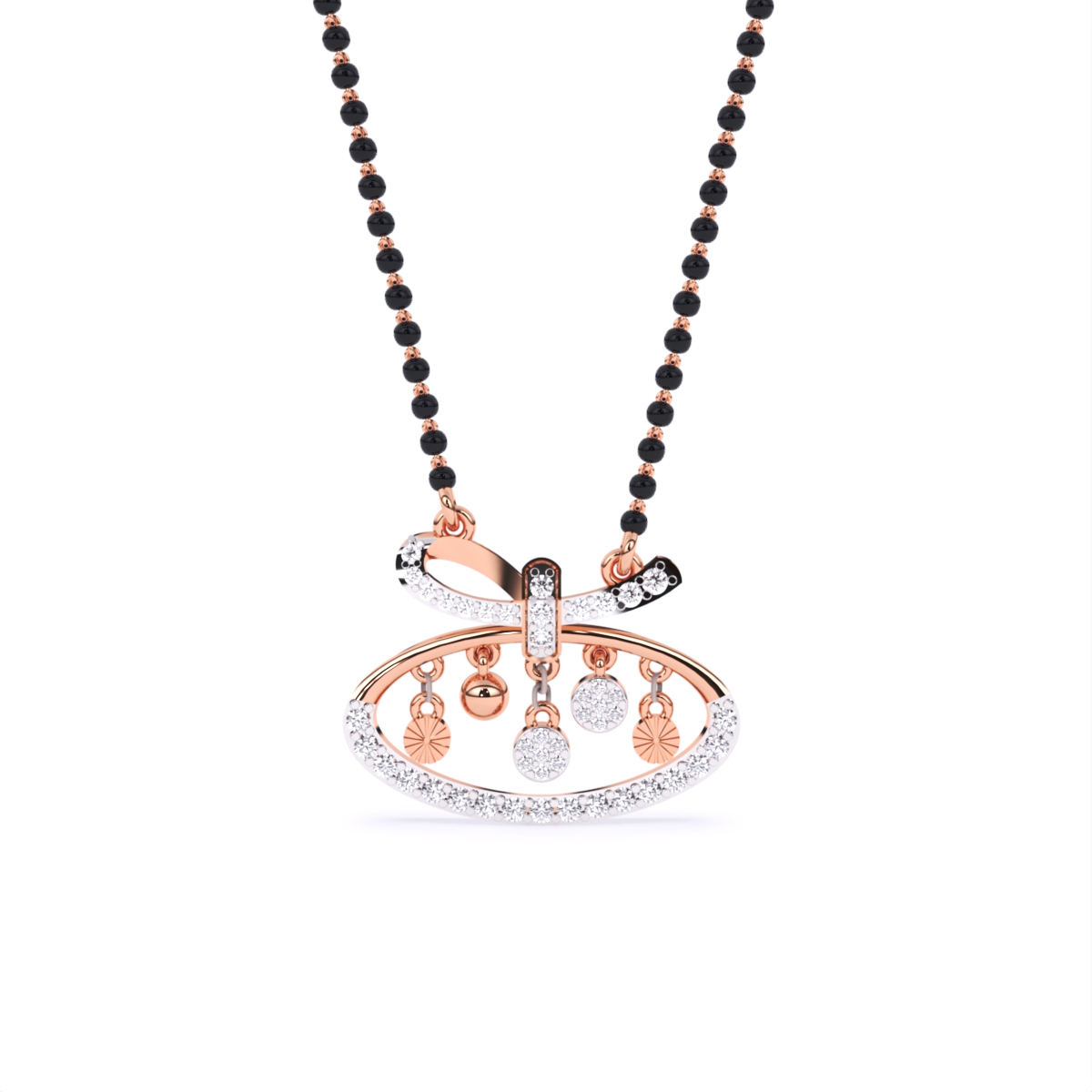 1 StoneInfuse your everyday style with playful elegance using this unique mangalsutra, designed to add a touch of whimsy to tradition. The centerpiece features a graceful, diamond-encrusted ribbon bow that sits atop a sweeping oval frame, creating a feminine and sophisticated silhouette. Inside this loop, a lively collection of charms dangles freely—featuring textured gold discs, sparkling diamond clusters, and a lustrous accent bead—creating a mesmerizing dance of light and movement with every step. Suspended on a traditional single strand of black beads, this necklace balances the sanctity of marriage with a fresh, fashionable aesthetic. Crafted in your choice of solid 9K, 14K, or 18K yellow, white, or rose gold, it is a conflict-free piece designed to be a conversation starter.