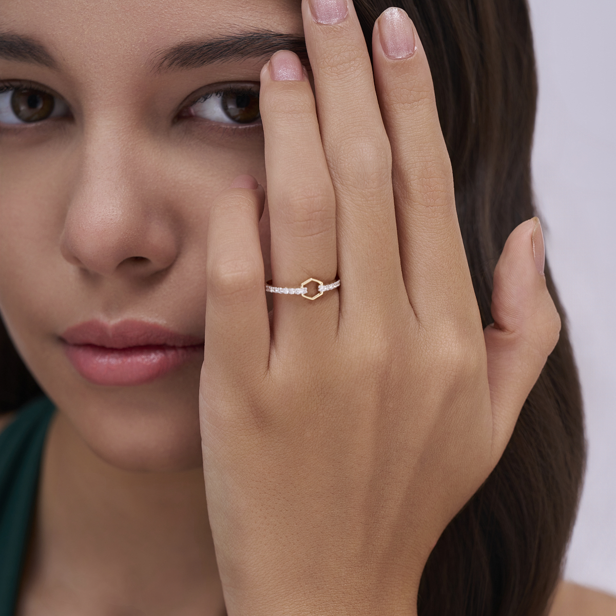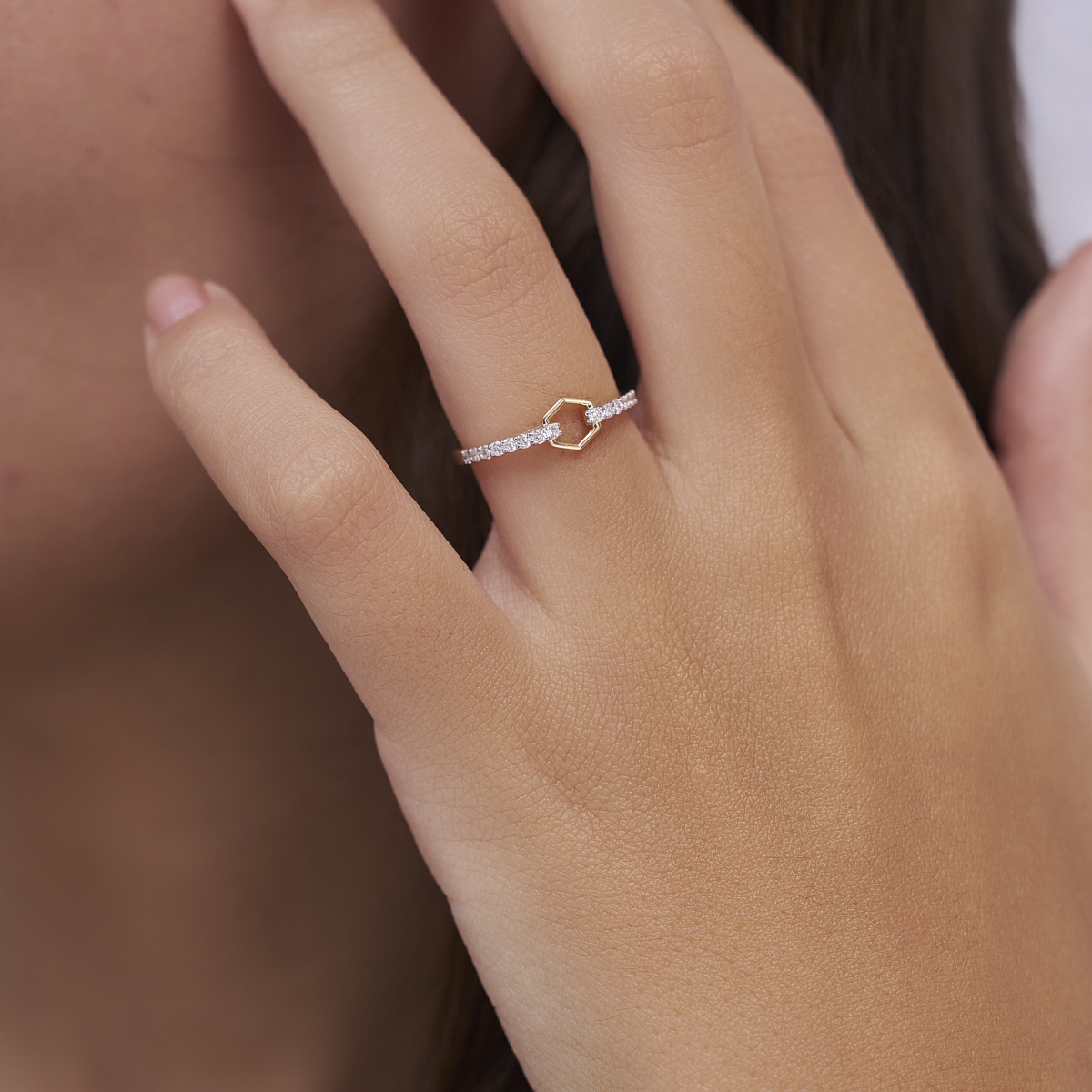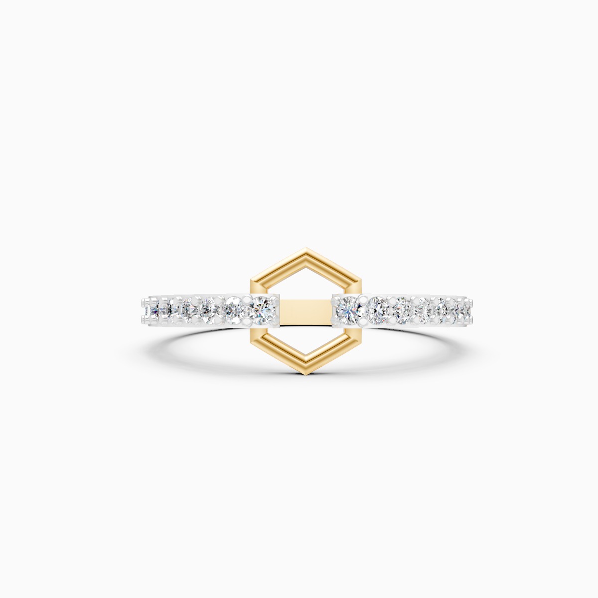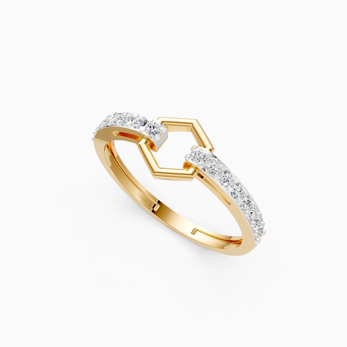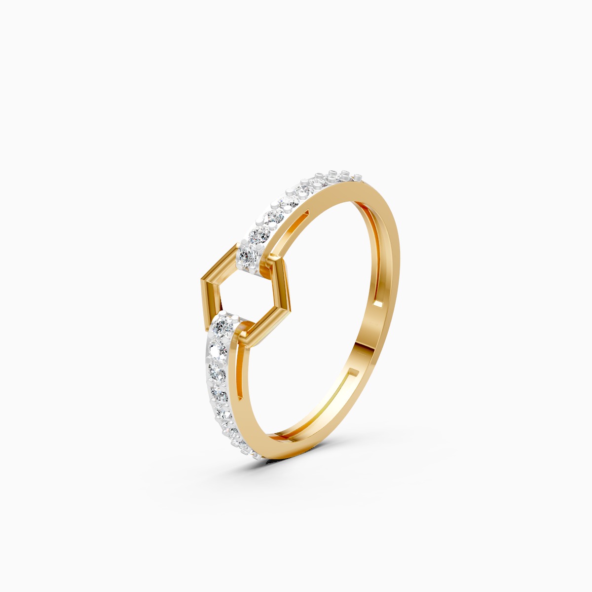 0 StoneThis modern pavé hex link ring features two softly curved bands accented with a geometric hexagonal link at the center, highlighted by a row of round lab-grown diamonds for refined sparkle. Set with round lab-grown diamonds in solid 9K, 14K, or 18K yellow, white, or rose gold, the design sits low and smooth on the finger, offering all-day comfort and ease. The structured geometry balanced with delicate pavé detailing makes it ideal for modern women who love clean lines with a subtle statement touch. Crafted using conflict-free, planet-conscious lab-grown diamonds, this ring reflects conscious luxury with contemporary appeal. Perfect for daily wear, office styling, and polished evenings, it transitions effortlessly from work to after-hours as a distinctive yet wearable signature piece.