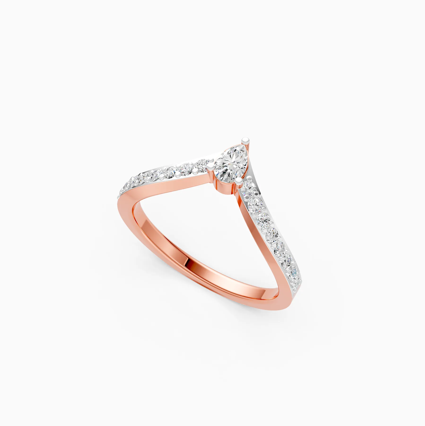 0 StoneThis sleek and stylish ring features a contemporary V-shaped silhouette, often known as a wishbone design, which elegantly elongates the look of the finger. At its apex sits a luminous pear-shaped diamond, serving as a striking focal point atop the sharp geometric curve. The band is meticulously set with a row of round brilliant diamonds, adding a continuous trail of sparkle. Handcrafted in 9K, 14K, or 18K yellow, white, or rose gold with sustainable lab-grown diamonds, this versatile piece is ideal for stacking with other rings or wearing alone as a refined, modern statement for the everyday woman.