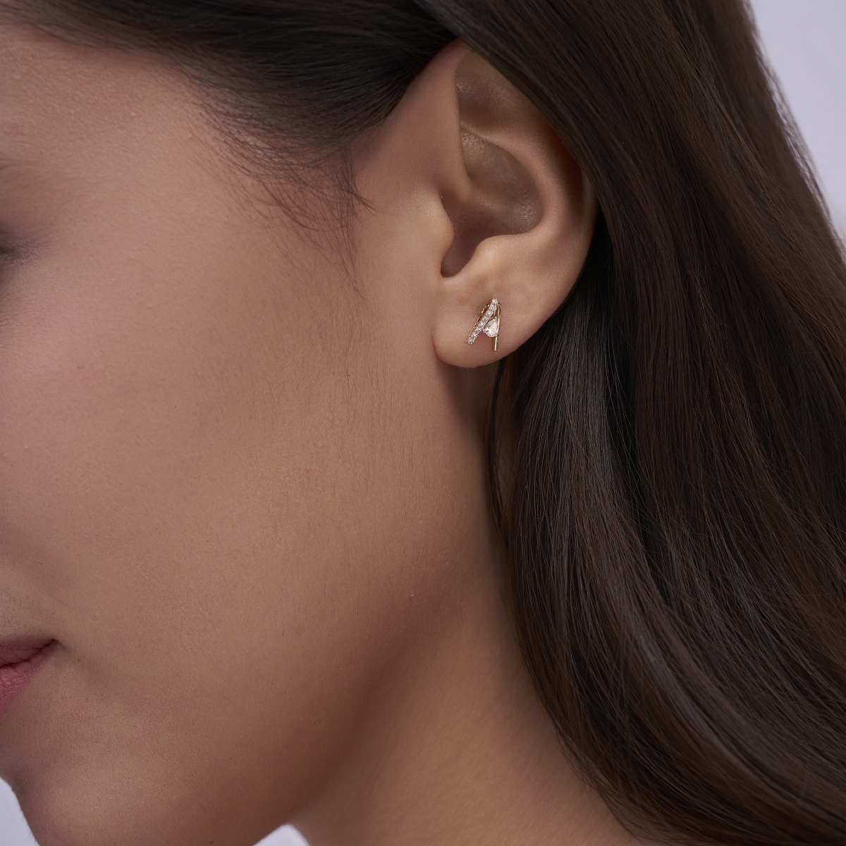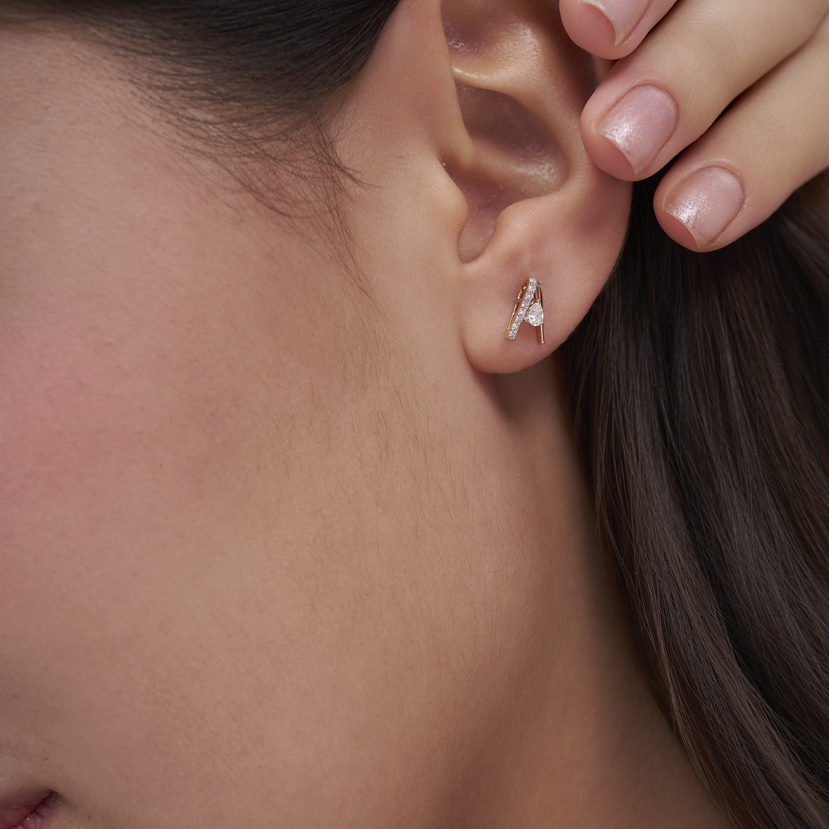 0 StoneThese modern stud earrings feature a striking geometric silhouette accented with pear-shaped and round lab-grown diamonds, creating a refined play of angles and sparkle. Crafted in solid 9K/14K/18K yellow, white, or rose gold, the design feels architectural yet elegant, sitting comfortably on the ear for all-day wear. Thoughtfully set with lab-grown diamonds, they offer a conflict-free, planet-conscious alternative to mined diamonds, making them ideal for women who value conscious luxury. Lightweight and balanced, these studs transition seamlessly from office wear to evening outings, adding a confident, contemporary reminder of everyday elegance to a modern woman’s wardrobe.