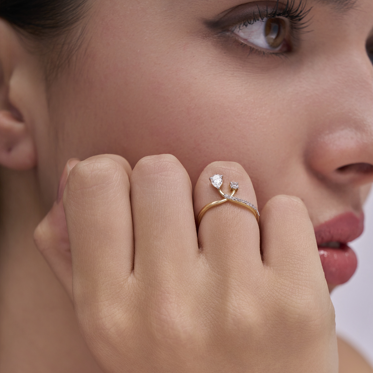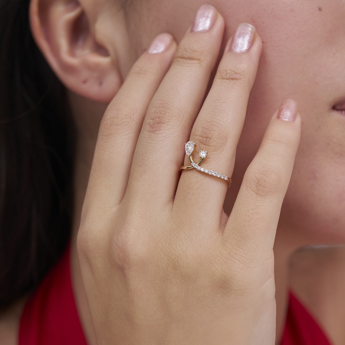 0 StoneAn elegant twist on the classic solitaire, this open swirl ring pairs a pear-shaped lab-grown diamond with a bright round stone, set slightly apart for a modern, airy feel. A fine row of pavé diamonds traces the band, catching the light with every movement. Crafted in warm rose gold, the fluid bypass silhouette wraps softly around your finger, giving the illusion of a delicate floating sparkle. Light, refined and comfortable, it’s the kind of piece you slip on once and forget to take off. Wear it solo for understated shine, or stack it with slim bands to build your own everyday ring story – from desk to drinks and everywhere in between.