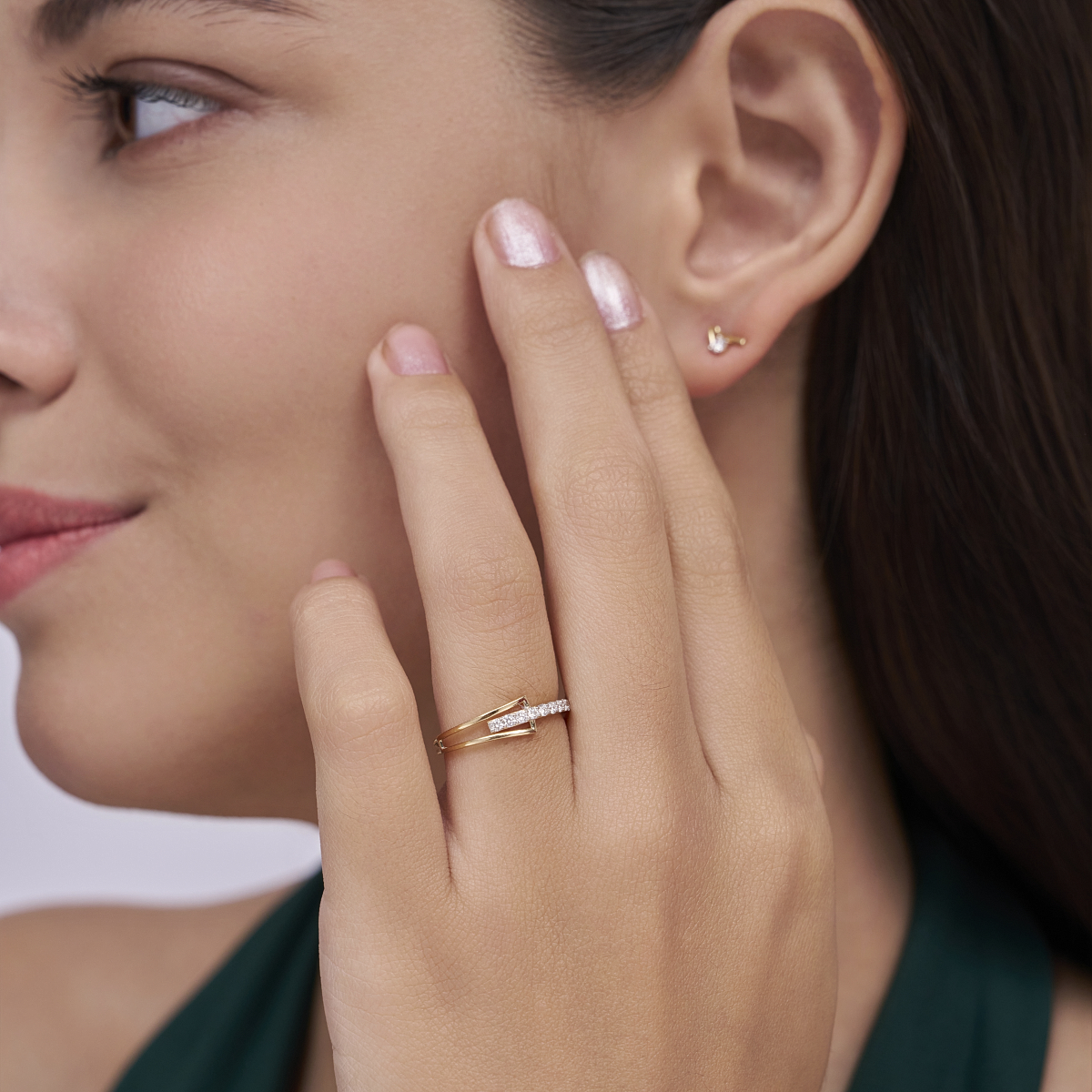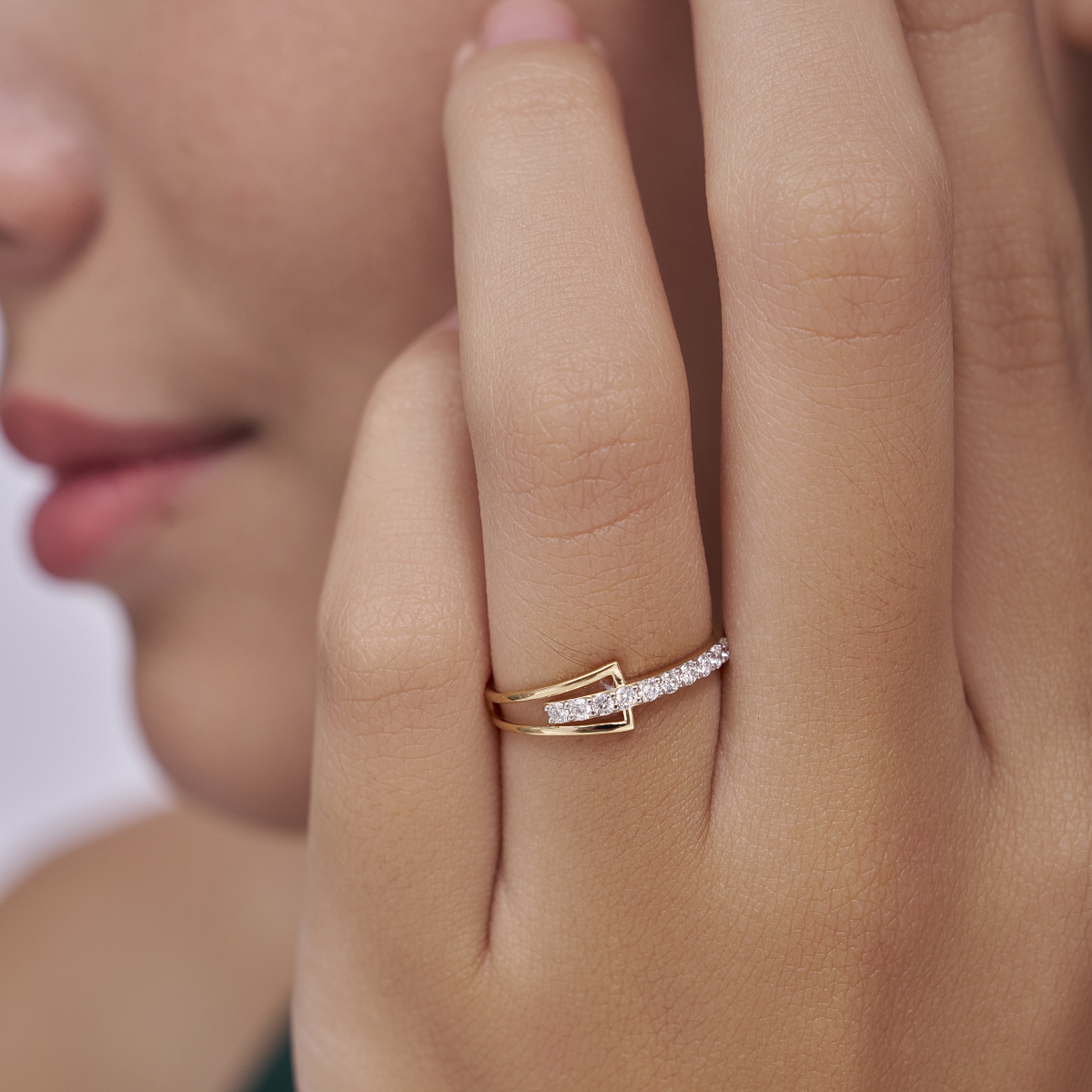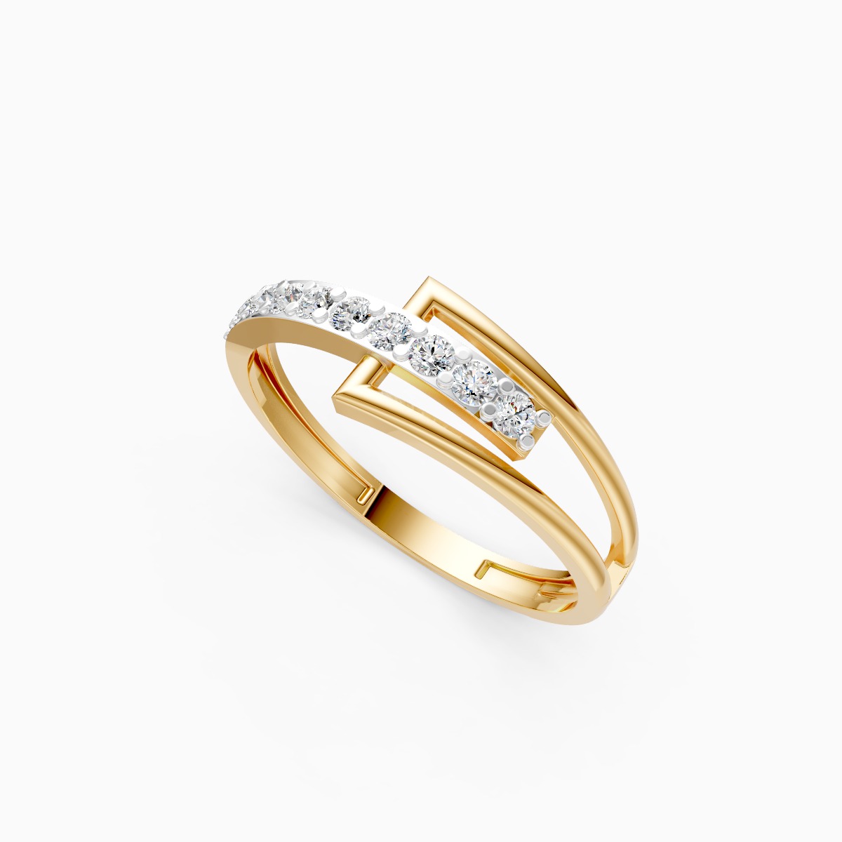 0 StoneA modern crossover ring featuring a slim double-band and a pavé bar set with round lab-grown diamonds, designed to deliver a clean, architectural sparkle without bulk. Set with round lab-grown diamonds in solid 9K, 14K or 18K yellow, white or rose gold, the piece is lightweight, skin-friendly and sits comfortably with a low, secure profile—perfect for women who prefer subtle, contemporary details. The pavé bar adds refined brilliance while the split-band silhouette keeps the look minimal and versatile; wear it alone as an everyday signature or layer with slim bands for a polished office-to-evening style. Ethically made with conflict-free, planet-conscious lab-grown diamonds, this ring is a sustainable, modern choice for daily wear, date nights and effortless stacking.