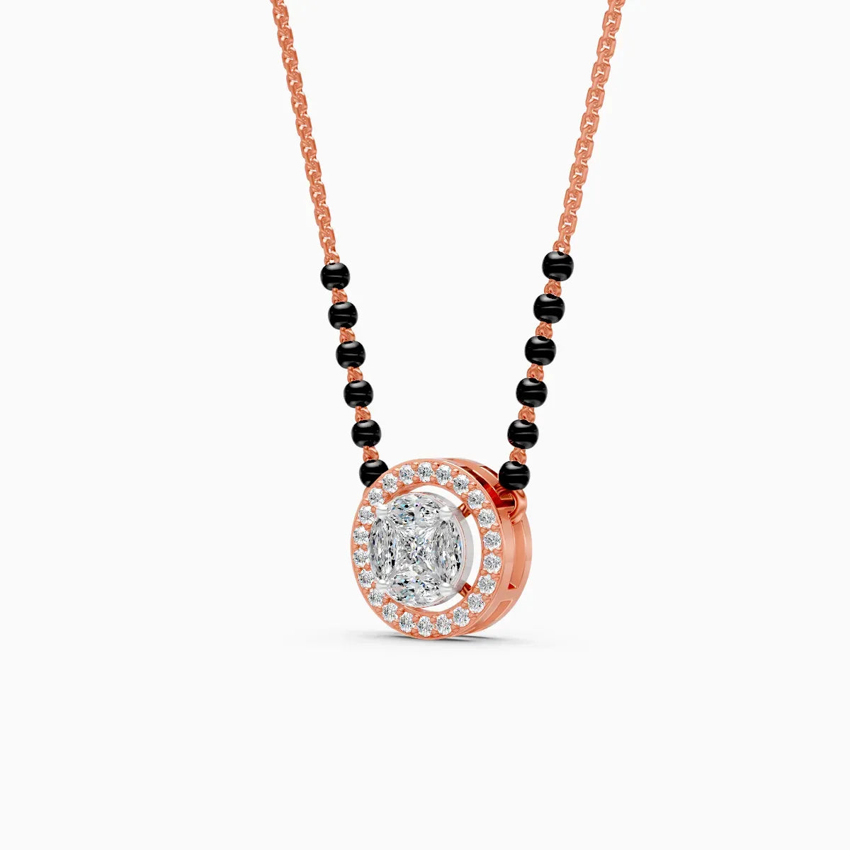 A modern take on tradition, this halo circle diamond mangalsutra features a luminous central cluster of marquise, princess and round lab-grown diamonds framed by a delicate pavé halo, suspended on a sleek combination of black beads and fine chain. Crafted in solid 9K/14K/18K yellow, white or rose gold, the pendant sits flat against the collarbone for all-day comfort and a smooth, skin-friendly feel. The conflict-free, planet-conscious lab-grown diamonds offer brilliant sparkle without compromising your values, making it perfect for modern women who want their mangalsutra to feel as minimal and refined as the rest of their wardrobe. Style it as your everyday signature for work, brunches and intimate celebrations, or layer it with other Ayaani chains for a contemporary stacked look.