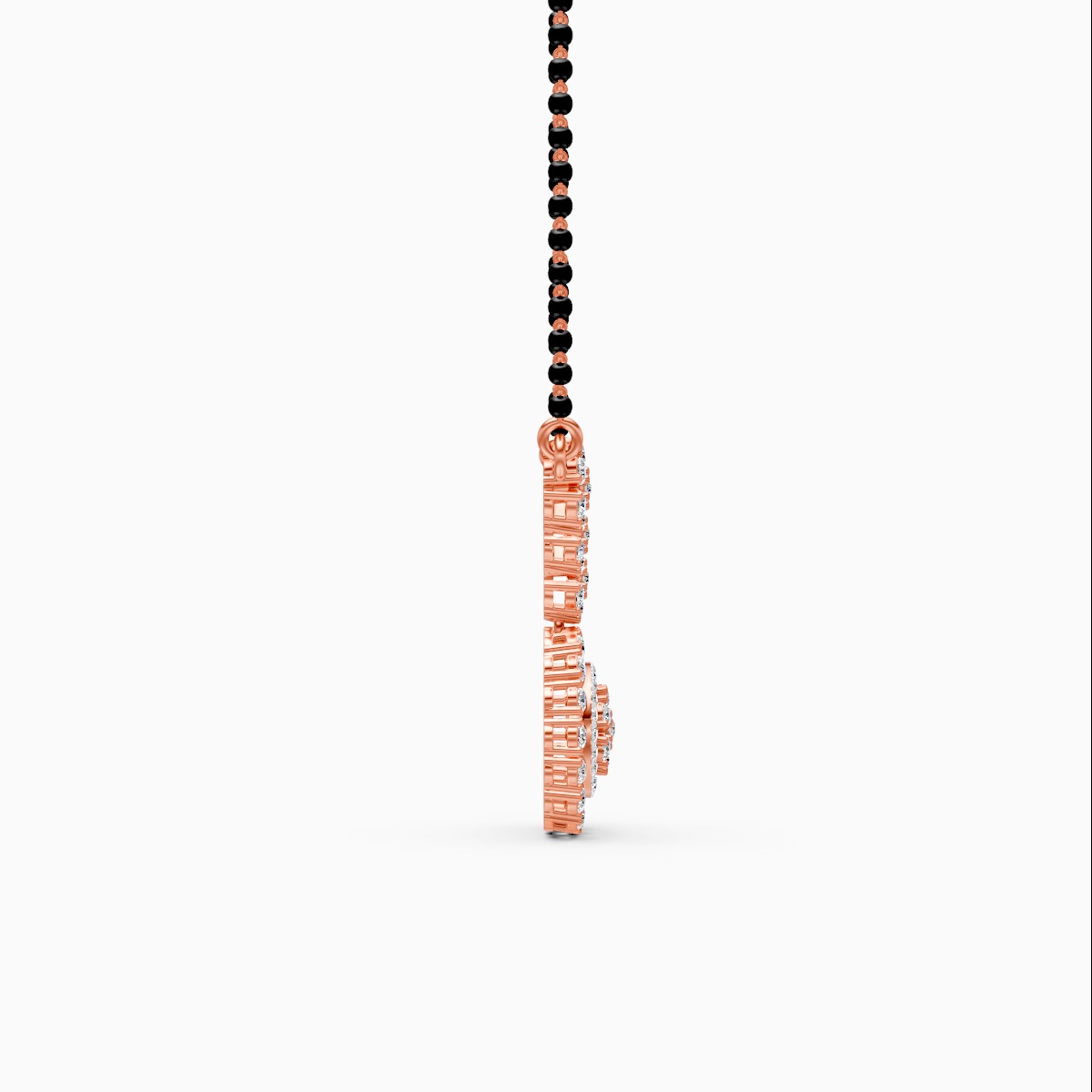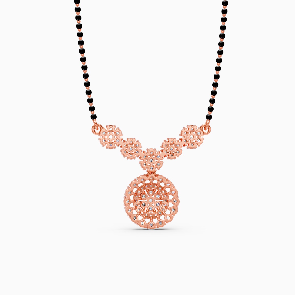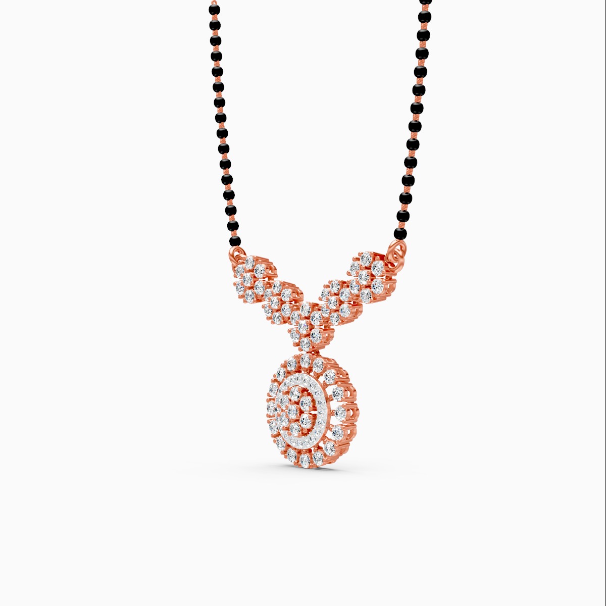 1 StoneCelebrate your timeless bond with this exquisite mangalsutra, a stunning blend of traditional grandeur and modern brilliance. The focal point is a magnificent round pendant featuring a concentric floral halo design, densely paved with glittering lab-grown diamonds for maximum radiance. This central drop is suspended from an elegant V-shaped yoke adorned with smaller floral diamond clusters, creating a cohesive and luxurious neckline. Strung on a classic single black bead chain, this necklace offers a regal yet refined look perfect for weddings, festivals, or elevating everyday wear. Crafted in your choice of solid 9K, 14K, or 18K yellow, white, or rose gold, it is a conflict-free masterpiece designed to be cherished forever.