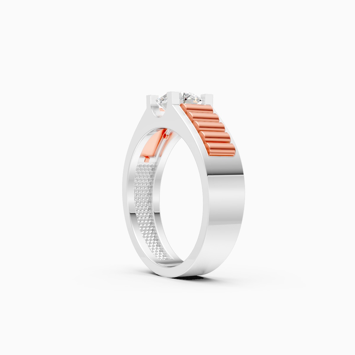 0 StoneA bold take on a classic, this ribbed solitaire band features a striking round lab grown diamond held in a clean four-prong setting, flanked by linear metal ridges that give the ring its strong, architectural look. Crafted in solid 9K/14K/18K yellow, white and rose gold, it is designed for modern men who want everyday luxury with a refined edge. The lab grown diamond offers the brilliance of a traditional stone with a conflict-free, conscious footprint, while the smooth inner shank keeps the ring comfortable for long wear, from office hours to evening plans or even as a contemporary engagement ring.