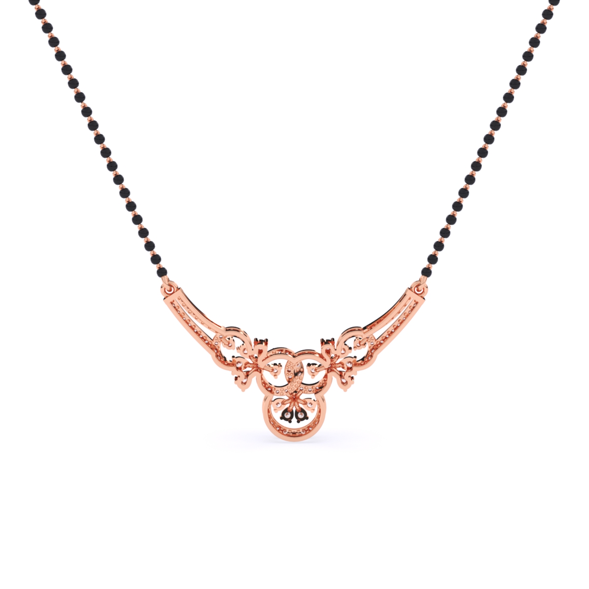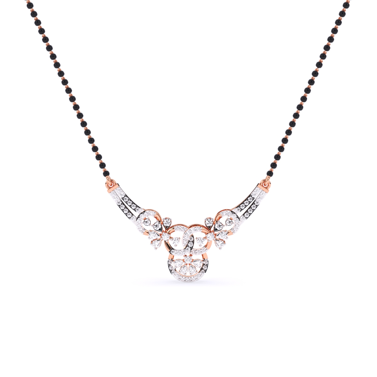 1 StoneSymbolize your eternal connection with this graceful mangalsutra, featuring a sophisticated interlocking design that blends modern curves with traditional sparkle. The pendant showcases sweeping arches of pave-set lab-grown diamonds that converge to hold a radiant central floral cluster, creating a seamless "knot" of brilliance. This refined, necklace-like aesthetic sits elegantly against the collarbone, making it perfect for pairing with both sarees and contemporary western wear. Suspended on a classic single strand of black beads, it offers a lightweight and comfortable fit for everyday use. Crafted in your choice of solid 9K, 14K, or 18K yellow, white, or rose gold, it is a conflict-free celebration of love designed for the modern woman.