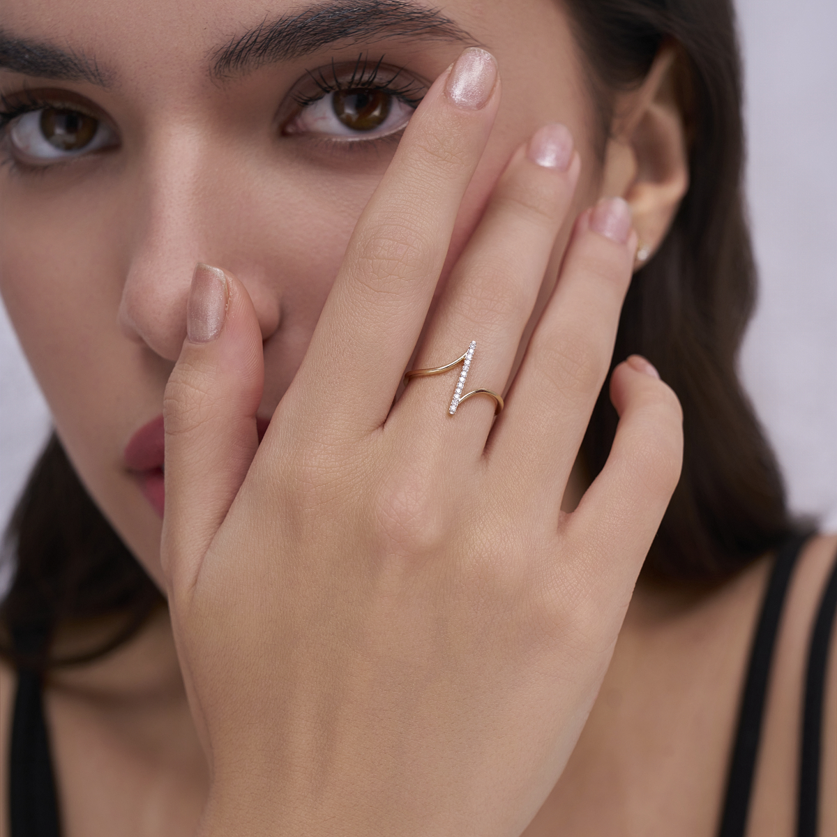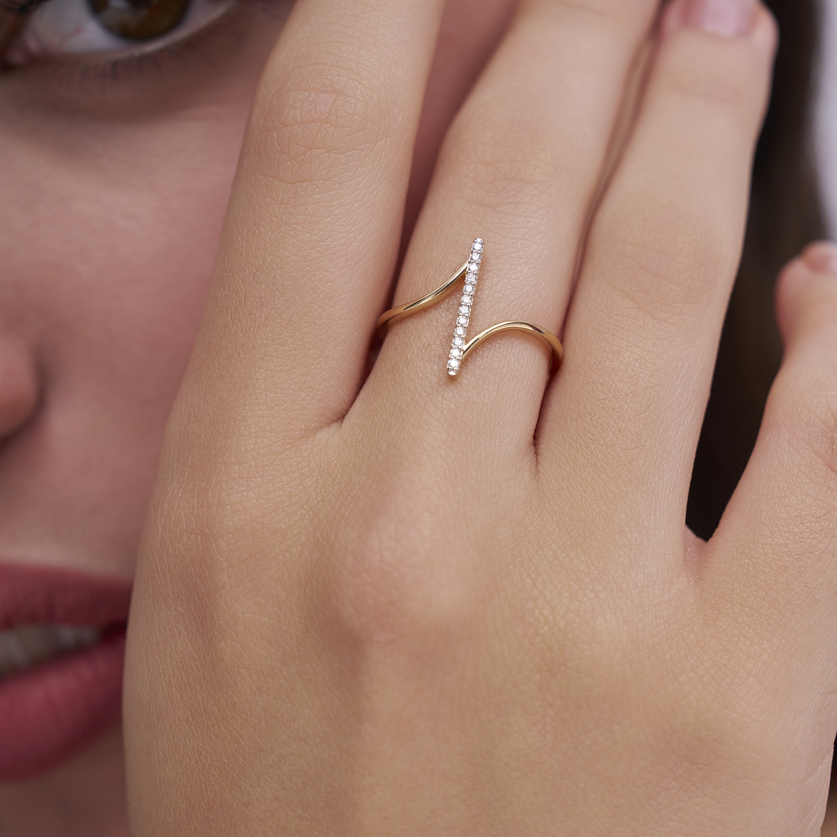 0 StoneThis sculptural curved diamond bar ring features a slim open band that sweeps into a fluid loop, topped with a sleek horizontal bar of round lab-grown diamonds for a clean, modern sparkle. Crafted in solid 9K/14K/18K yellow, white and rose gold, the lightweight band sits comfortably close to the finger with smooth edges that make it easy to wear all day. Designed for modern women who love minimal yet distinctive jewelry, it works beautifully as a standalone statement or stacked with other rings for daily wear, office meetings, brunches and date nights. Conflict-free, planet-conscious lab-grown diamonds add a refined shine that feels as good as it looks in your everyday rotation.