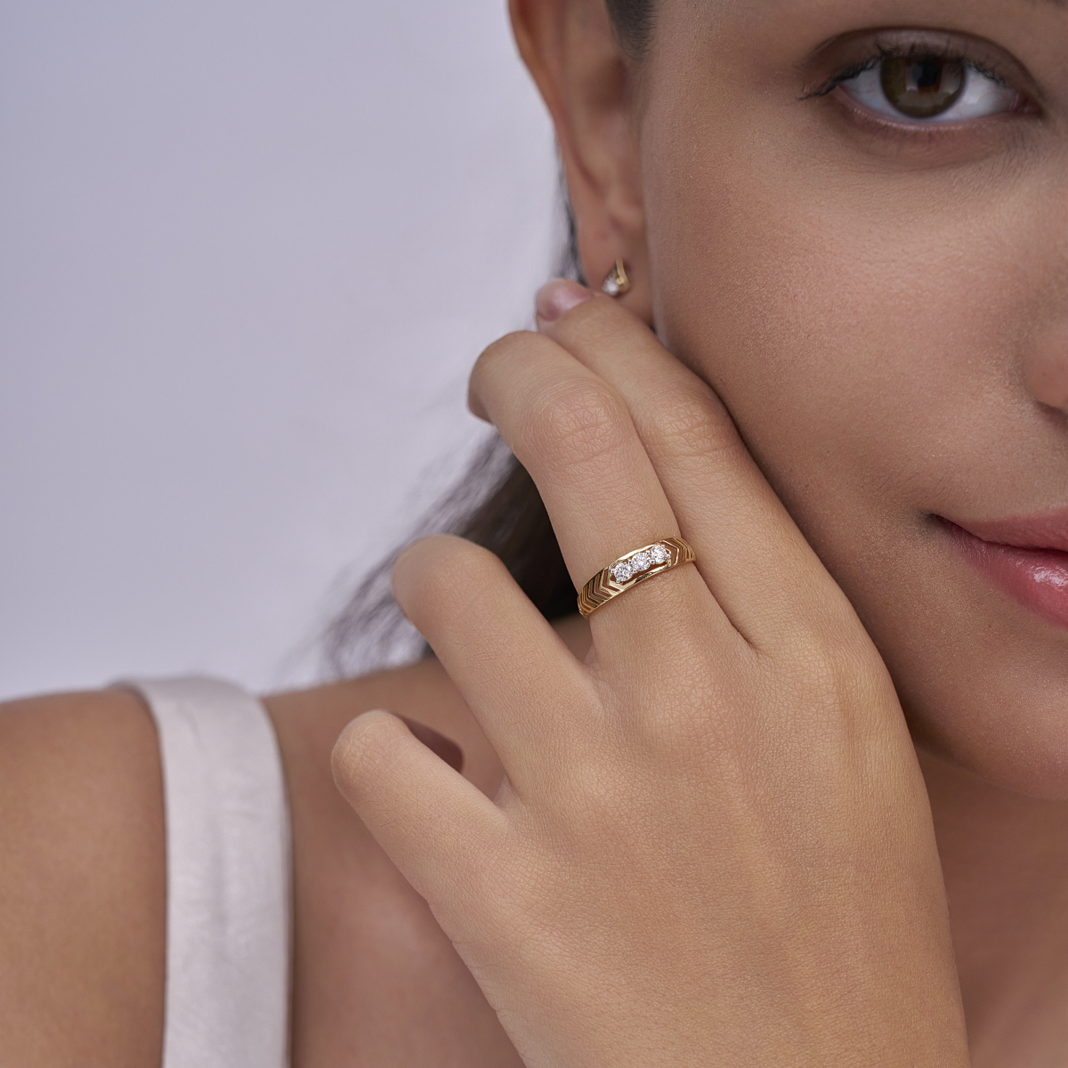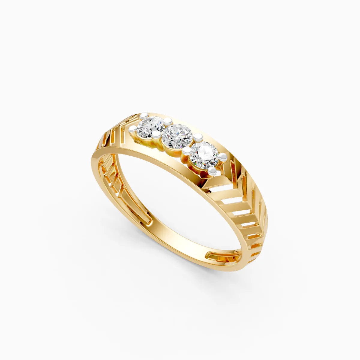 0 Stonethis trio diamond ring showcases three round lab-grown diamonds set in a neat row, highlighted by a structured chevron-pattern band that adds a modern geometric touch. Designed for modern women, it is set with lab-grown diamonds in 9K/14K/18K yellow, white and rose gold, offering a refined balance of sparkle and contemporary design. The slim yet detailed band feels lightweight and comfortable on the finger, making it easy to wear throughout long workdays and beyond. Minimal yet distinctive, this ring works beautifully as a daily wear essential, office-friendly piece, or a subtle statement for brunches, date nights, and special moments. Crafted with conflict-free, planet-conscious lab-grown diamonds, it reflects a conscious approach to fine jewelry while delivering timeless style for women who appreciate everyday elegance with a modern edge.