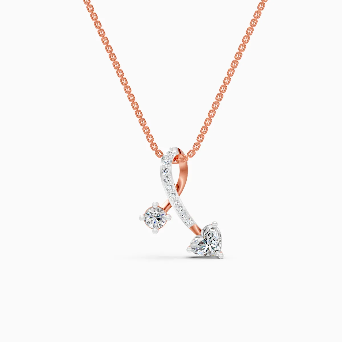 0 StoneA modern ribbon-curve pendant necklace that pairs a heart-shaped lab-grown diamond with a round brilliant drop, accented by a sleek line of round diamonds for effortless sparkle. Set with lab-grown diamonds in solid 9K/14K/18K yellow, white and rose gold (shown in rose), it’s a conflict-free, planet-conscious alternative to mined diamonds—made for modern women who like their jewellery minimal yet meaningful. The fluid, lightweight silhouette sits comfortably on the collarbone and layers beautifully with everyday chains, taking you from office hours to date nights and special occasions with an easy, elegant glow.