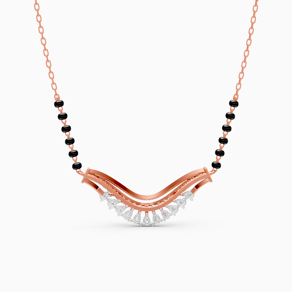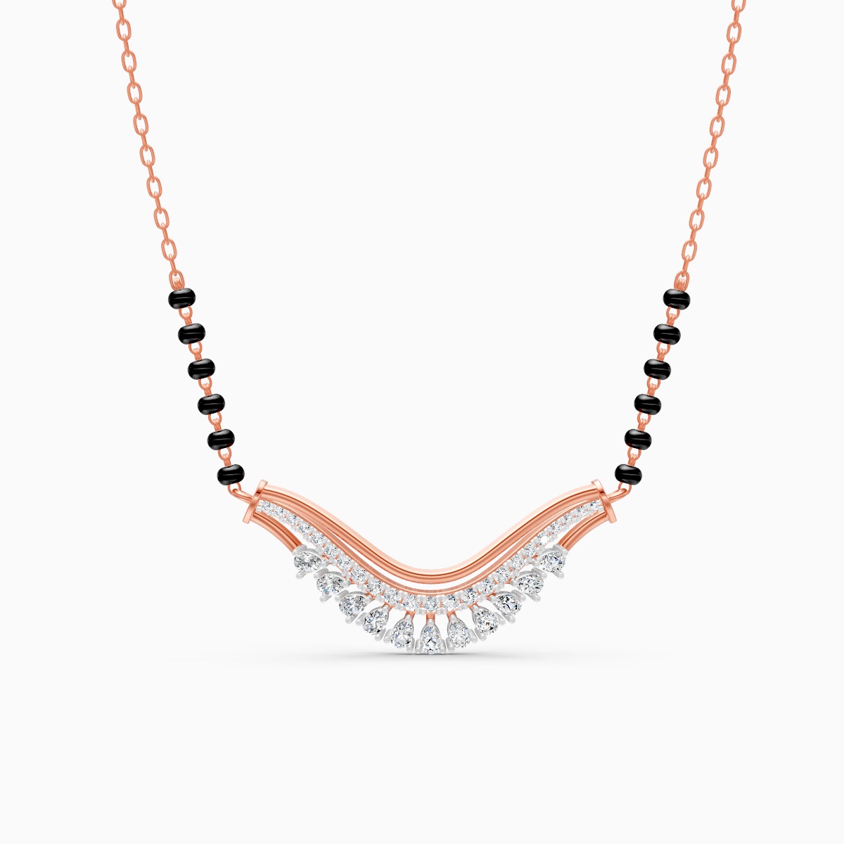 0 StoneThis pear fringe curve mangalsutra features a graceful V-shaped centre crafted in solid 9K/14K/18K yellow, white and rose gold, with a sleek triple-bar curve accented by a row of pavé-set round lab-grown diamonds and a cascading fringe of pear-shaped stones. Paired with a delicate black-bead chain, it gives a fresh, contemporary twist to a traditional symbol, sitting comfortably along the collarbone for all-day wear. Designed for modern married women who love refined yet statement-making pieces, this skin-friendly, conflict-free lab grown diamond mangalsutra moves effortlessly from daily and office wear to brunches, festive celebrations and evening occasions—adding luminous movement and modern elegance to every look.
